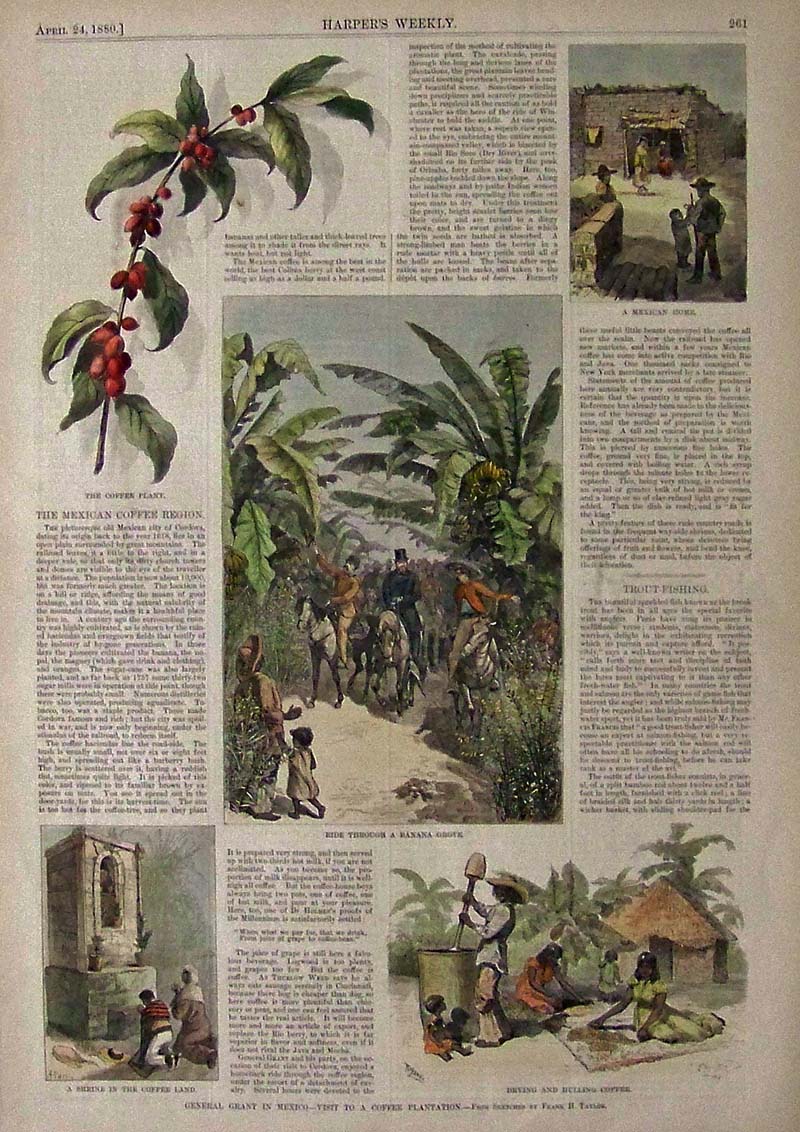 US Grant Visits Mexican Coffee Farm. Antique hand colored engravings
