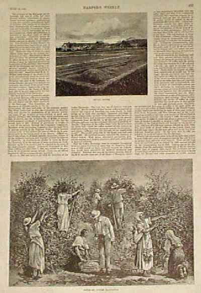 Wood engraving from South America showing a "Coffee Gathering" in top