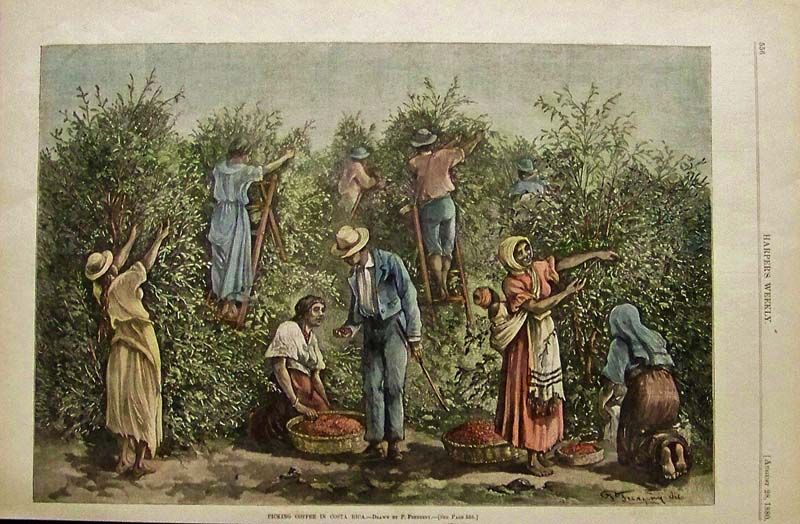 Coffee Picking in Costa Rica. Beautifully hand colored engraving from