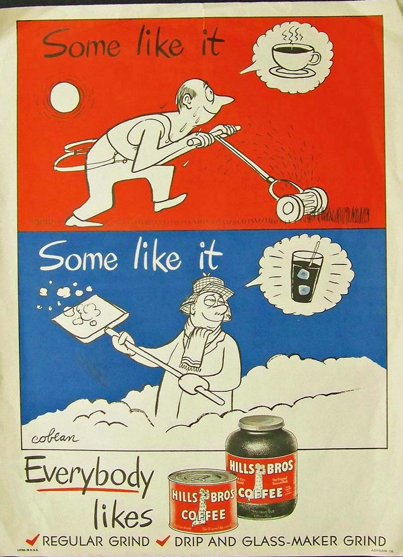 Chromolithograph advertising Hills Bros Coffee which shows a man mowing