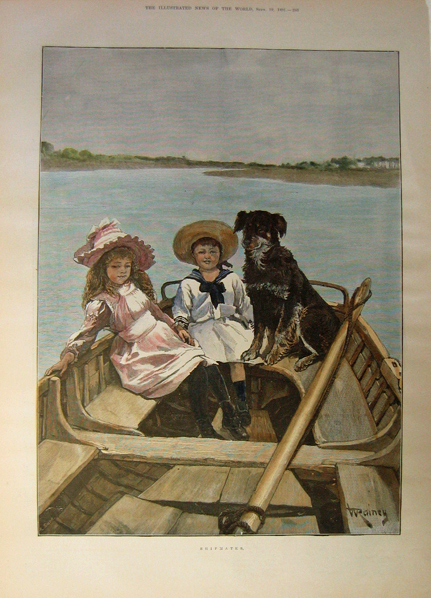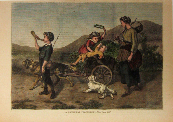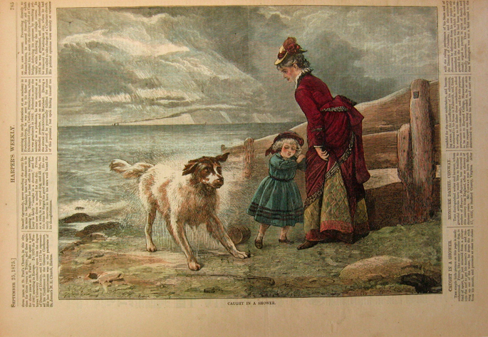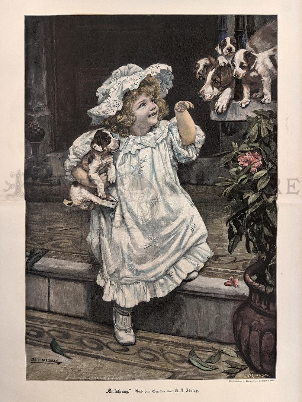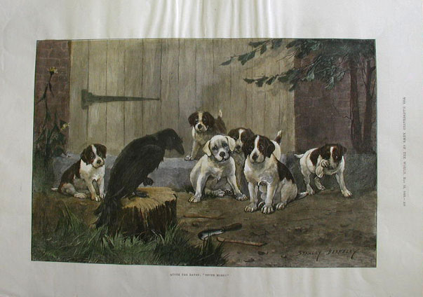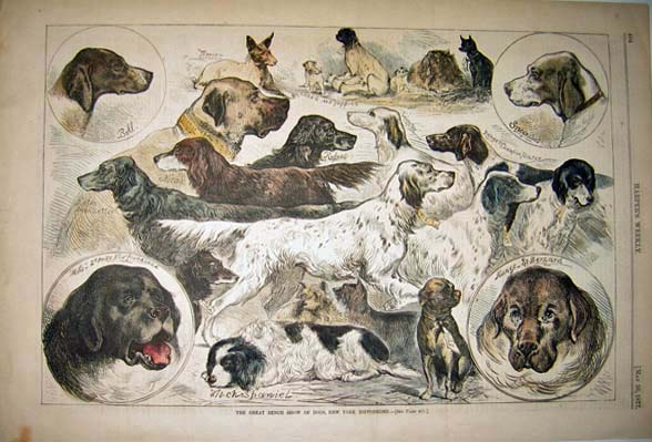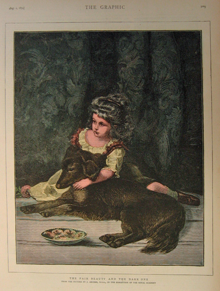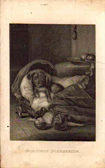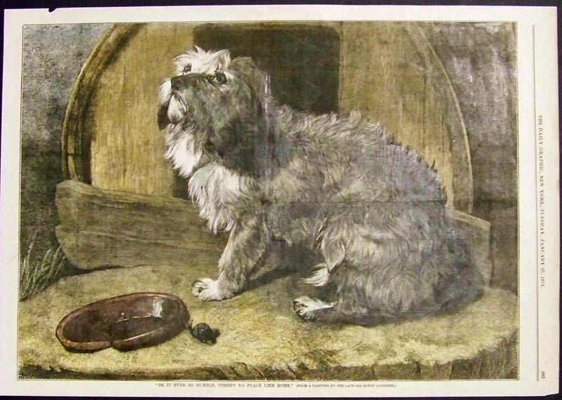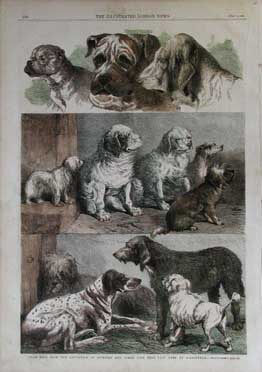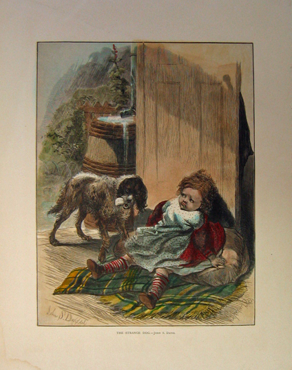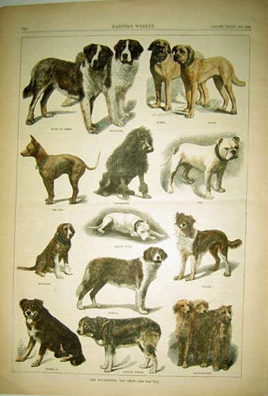 ![]() 006dog: 1907 An After-Dinner Relief. This hand colored enraving by Chas P. Gibson shows a dog becoming the object of a dinner parties attention. size: 11x16 in. $40 ![]() 008dog: circa 1880 English Mastiffs. This black and white engraving is from The Aldine. The scene shows 4 English Mastiffs in a barn with a horse in the background. 11x16 in. $40 ![]() 009dog: 1852 Six hand colored engravings of dogs from Gleason's Pictorial Drawing Room Companion. Dogs pictured: the Pointer, Devonshire Dog, Beagle, Hunting Hound, the Setter, and the Terrier. size: 11x16 in.$40 ![]() 011dog: Circa 1880 "Forcible Posession. This lovely black and white steel engraving shows a puppy taking over a dolls bassinet for it's bed. 9.5x5.75 in. $40 ![]() 013dog: 1899 "Beauty at the Dog Show." The annual dog show at Madison Square Garden, New York, exhibits the ugliest specimens of canine ferocity and attracts the gentlest of society's women and children.This hand colored half tone is from the March, 1899 edition of Leslie's Weekly. 11x16 in. $50 ![]() 016dog: 1861 Hand colored antique wood engraving featured in The Illustrated London News showing three separate images of prize-winning dogs. Title of print is, "Prize Dogs From the Exhibition of Sporting and Other Dogs Held Last Week At Birmingham." 15 x 9-1/2 in. $50 ![]() 019dog: Ivory Soap ad from 1903. Hand colored ad shows two children washing puppies while the mother dog looks on, as if they are teaching her to keep her puppies clean. Excellent condition. 10x15 in. $30 ![]() 020dog: Large hand colored centerfold from Harper's Weekly published May 22, 1880. Titled 'The Dog Congress - Candidates for the Bench Show.' Drawn by W.H. Beard. Article about image on reverse. Excellent condition. 16 X 22 in. $90 ![]() 021dog: Revolutionists. Hand colored half tone from the December 31, 1898 issue of The Illustrated London News. 16x11 in. $40 ![]() 022dog: Beautiful hand colored wood engraving from the May 10, 1890 issue of The Illustrated News of the World. Image titled, Quoth the Raven: "Never More!". From a drawing by Stanley Berkeley. 16x11.5 in. $40 ![]() 030dog: Hand colored wood engraving of a young boy sleeping with dog, taking a break on his long walk to London, sign behind him says 'London 27 miles'. Published December 31, 1870 in Every Saturday. Caption reads 'His only friend'. Excellent condition. 11 X 14.5 in. $50 ![]() 032dog: 1891 Two little girls and a dog in a row boat. Hand colored engraved image titled, "Shipmates," drawn by W. Rainey from The Illustrated News of the World. Shows scene of two little girls and a dog in a row boat. 11 x 16in. $50 ![]() 033dog: A little girl and a dog. Hand colored engraved image titled, "The Strange Dog," drawn by John S. Davis. Shows scene of a little girl and a dog. 11 x 16in. $40 ![]() 034dog: 1921 A little girl and her dog in the rain. Hand colored engraved image titled, "Local Showers," drawn by J.R. Shaver from Life Publishing Company. Shows scene of a little girl and her dog in the rain. 10 1/2 x 8 1/2in. $40 ![]() 035dog: Picture of two little girls, a little boy and their dog. Hand colored engraved image titled, "The Pet of the Household." 9 1/2 X 5 1/2in. $20 ![]() 036dog: 1874 depicting a little girl and her dog. Hand colored engraved image titled, "The Fair Beauty and The Dark One," drawn by J. Archer from The Graphic. Shows scene of a little girl and her dog. 11 x 16in. $40 ![]() 037dog: A mother, her three children and her two dogs. Hand colored engraved image titled, "A Triumphal Procession." Shows scene of a mother, her three children and her two dogs. 10 1/2 x 7 1/2in. $50 ![]() 038dog: 1875 Antique engraving depicting a mother and her daugher with their dog shaking to get dry. Hand colored engraved image titled, "Caught in a Shower," from Harper's Weekly. Shows scene of a mother and her daugher with their dog shaking to get dry. 11 x 16in. $40 ![]() 039dog: 1897 Antique engraving depicting a mother with her two children and their dog. Hand colored engraved image titled, "Lady Betty Delme," from The Graphic. Shows scene of a mother with her two children and their dog. 11 x 16in. $50 ![]() 040dog: Picture of a little girl and her dog. Hand colored engraved image titled, "Not for Pluto," drawn by Hugo Erola from The Aldine. Shows scene of a little girl and her dog. 11 x 16in. $40 ![]() 044dog: This chromolithograph was published by Vincent, Brooks, Day & Son. Depicted within Cassell's Illustrated Book of Dogs, published in 1870s. Titled "Pomeranian Dog" - "Maltese" and is in excellent condition. This print is among the finest examples of chromolithography. 8.5 x 10.75 in. $100