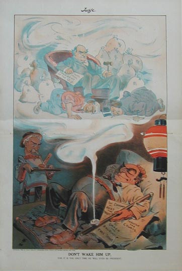 ![]() 001drug: 1858 Antique Opium Smoking Saloon print. Original black & white engraving, with descriptive text on reverse, from Harper's Weekly. 5x10 in. $30 003drug: 1960 Chinese Prisons for Addiction. Page from 1960 Life magazine showing how the Chinese imprison their drug users. Black & white photo. 10x13-1/2 in. $30 004drug: 1908 Color lithograph from Puck Magazine showing Congressman Cannon smoking the pipe of Obstruction. 10x14 in. $40 005drug: 1908 William Jennings Bryan in Stupor. Political cartoon from Judge Magazine showing William Jennings Bryan under the influence of opium, dreaming about becoming president. Caption reads "Don't wake him up, for it's the only time he will ever be president." Original color antique lithograph. 13x20 in. $60