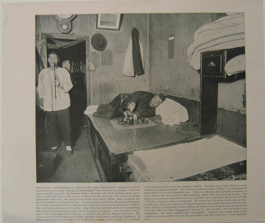 101drug: 1860 Opium Den in China. Dark, engraved scene inside a Chinese opium den where smokers are lying on wooden bunks. To the left of the image, part of an article describes the opium situation in China. $40 105drug: Picture of two men in an opium den in Chinatown, San Francisco. Elegant image titled, "Opium Den, Underground, Chinatown, San Francisco." Shows scene of two men smoking opium in an opium den in Chinatown, San Francisco. 12 x 10in. $30 |