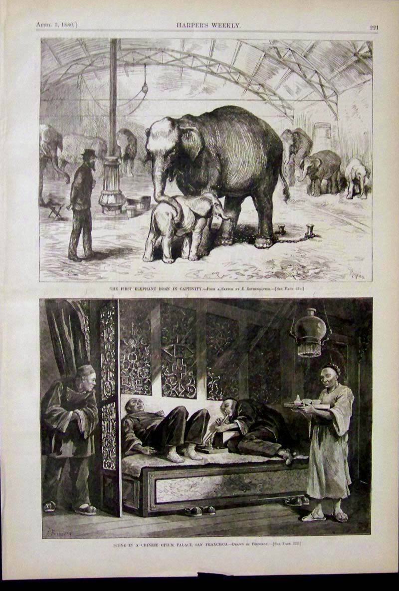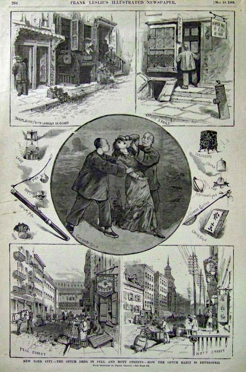 114drug: 1883 Rare wood engravings on one page featured in Frank Leslie's Illustrated Newspaper titled, "New York City -- The Opium Dens in Pell and Mott Streets -- How the Opium Habit is Developed." From Sketches by Frank Yeager. Images depict how habit is developed. 15 x 11 in. $80