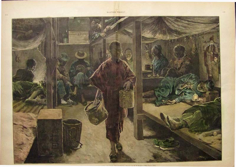115drug: 1860 Wood engraving featured in Harper's Weekly showing in bottom engraving, "Scene In A Chinese Opium Palace, San Francisco." Drawn by Frenzeny .16 x 11 in. $35 SOLD