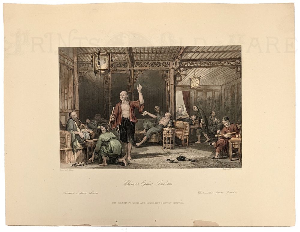 117drug: 1888 Double-page hand colored wood engraving featured in Harper's Weekly titled, "Underground Opium Den in San Francisco." Drawn by H.F. Farny. Fine condition. 20 x 15 in. $150 Color: $175 ![]() 235chin: Chinese Opium Smokers 1847. Hand colored, steel engraving. Thomas Allom. Interior view of a Joss House. 8 x 10 5/8 in. $150 |