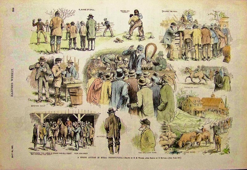 033frm: 1867 Harper's Weekly hand colored wood engraving showing Life on the Farm, Drawn by Herrick. Various scenes on page include Ploughing, Reaping, Mowing, Sowing, and Driving the Cows. 22 x 15-1/2 in. $100 ![]() 034frm: Farm Auction - Spring Auction in rural PA. 10 views of quiaint country life. 1887 Harper's Weekly. Hand colored wood engraving. 16 x 11 in. $40 ![]() 010fsch: An Autumnal Reminiscence & Assorting Poultry for the Fair. 1875 Harper's Bazar. Hand colored, wood engraving. 11 x 16 in. $80 |