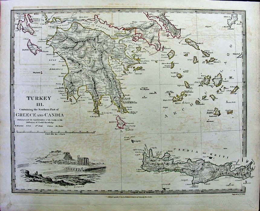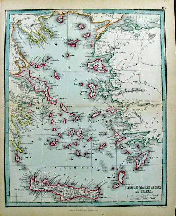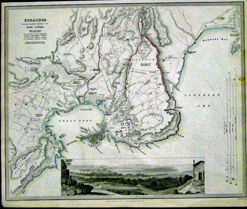 ![]() 205gr: 1829 Published by Baldwin & Gradock "Turkey containing the Southern Part of Greece and Candia" 16x13 in. $100 ![]() 206gr: 1850 Published by Thomas, Cowperthwait & Co. "Greece" 17x13.5 in. $100 ![]() 207gr: 1854 Published by Colton "Greece and the Ionian Republic" 17x14.5 in. $60 ![]() 208gr: C1850s Greece & Candia 17x13.5 in. $90 ![]() 209gr: 1894 Published by Tegg & Co. Greece "Insulae Maris Aegaei et Creta" 9.5x11.75 in. $60 ![]() 210gr: 1887 Greece for the Standard World Atlas 11.25x17.25 in. $40 ![]() 211gr: 1886 encyclopedia Britannica ninth edition Greece 10.25x7.75 in. $30 ![]() 212gr: 1832 Lightly hand colored steel engraved map of Athens, showing a detailed view of the Acropolis. Map is in fine condition and is embellished with vignettes showing the comparison of height of prominent buildings. Published under the Superindendence of the Society for the Diffusion of Useful Knowledge (S.D.U.K.) and published by Baldwin & Cradock, London. 16 x 13-1/2 in. $300 ![]() 213gr: 1839 Lightly hand colored steel engraved map of Syracuse, With the Remaining Vestiges of its Five Cities. Map is embellished with a "View of Syracuse from the Theatre" on bottom of map. Map is in fine condition and is published under the Superintendence of the Society for the Diffusion of Useful Knowledge (S.D.U.K.). Map is published by Chapman & Hall, London. 16 x 13-1/2 in. $150 |