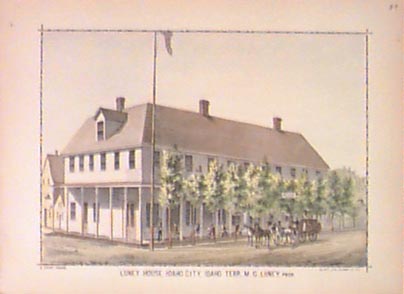 002id: 1884 Idaho City, Idaho Territory. Antique hand colored litho view of the early Luney House Hotel. 13-1/2x10-1/2 in. $60