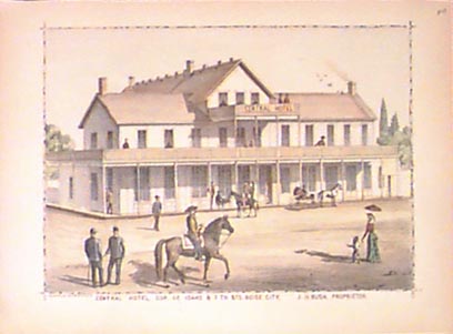 005id: 1884 Boise Idaho view. Hand colored litho view of Central Hotel, corner of Idaho & Seventh Streets, Boise City. 13-1/2x10-1/2 in. $60