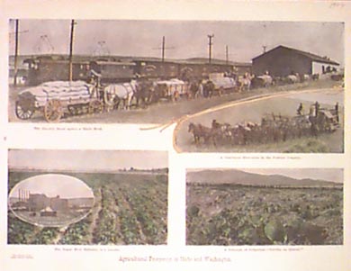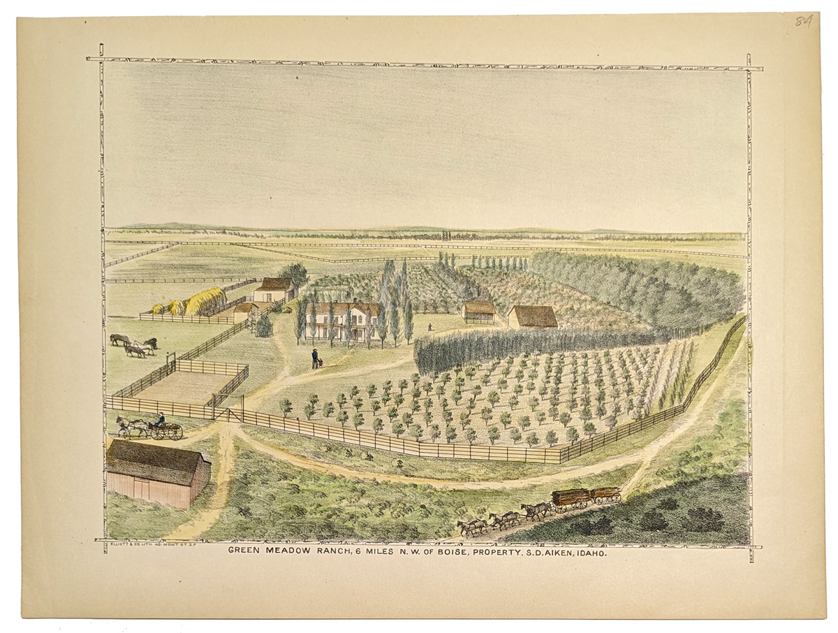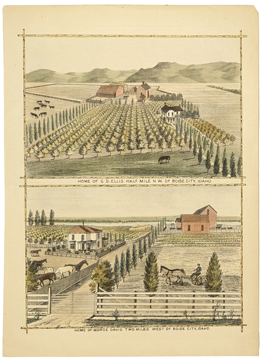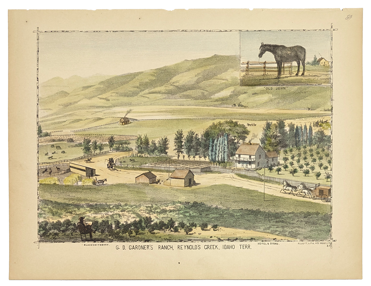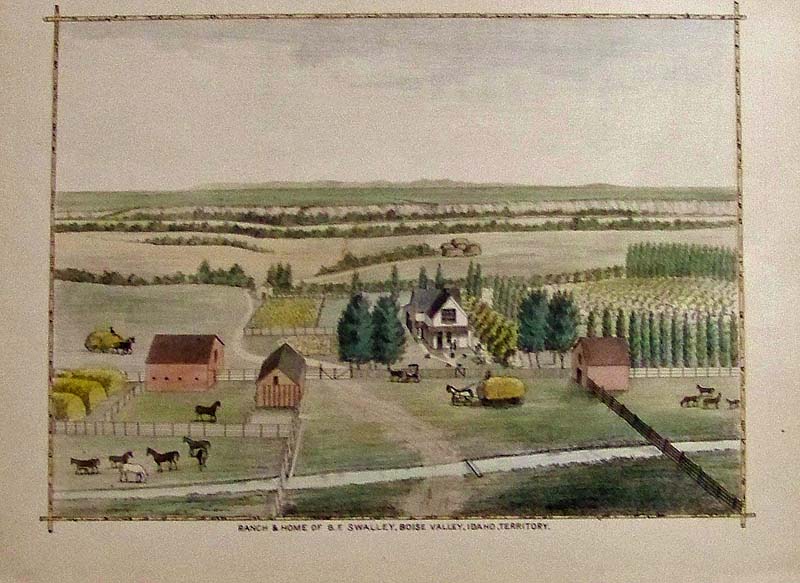 220idaho: 1884 Hand colored lithograph showing the Ranch & Home of B.F. Swalley, Boise Valley, Idaho Territory. 13-1/2 x 9-1/2 in. $60