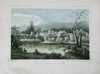 215idaho: 1853 Hand colored lithograph of the U.S.P.R.R. Exp. & Surveys General report Plate XXXV showing the Coeur D'Alene Mission St. Ignatius River. Lithograph by Sarony, Major & Knapp, NY. 11 x 8-1/2 in. $60