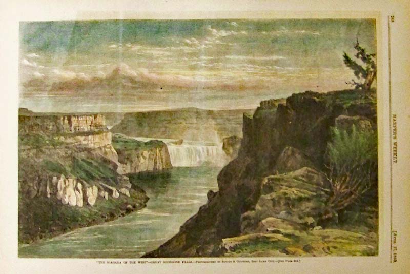 107id: Detailed 1901 Railroad Map of Idaho. Beautiful map from the 1901 first edition of George Cram's folio-size world atlas. Color coded lines on the map show the names and locations of railroads throughout the state. State and county borders are outlined in yellow. Cities, towns and geographical features are all shown. Locations of mining and logging districts are marked in light yellow print. This map would look great in a frame! 18x27 in. $120 ![]() 109idaho: 1869 "The Niagara of the West" - Great Shoshone Falls. Hand colored wood engraving published in Harper's Weekly. 15-1/2 x 11 in. $80
