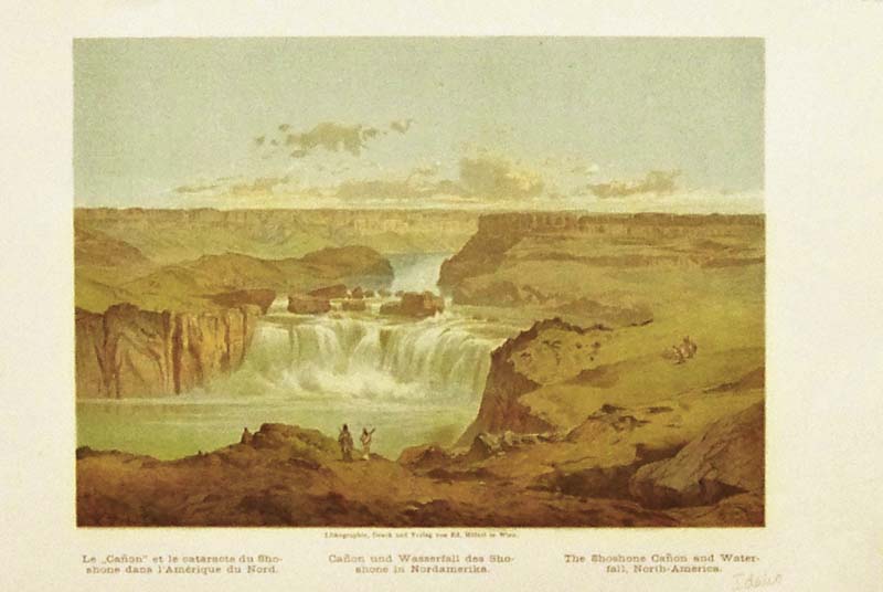 110id: C.1880 Color lithograph showing The Shoshone Canyon and Waterfall in Idaho, North America. 10-1/2 x 7 in. $40