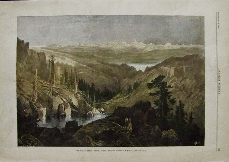 112id: 1882 Harper's Weekly hand colored wood engraving showing the Great Teton Range in Idaho, taking from a painting by T. Moran. 16 x 11 in. $80