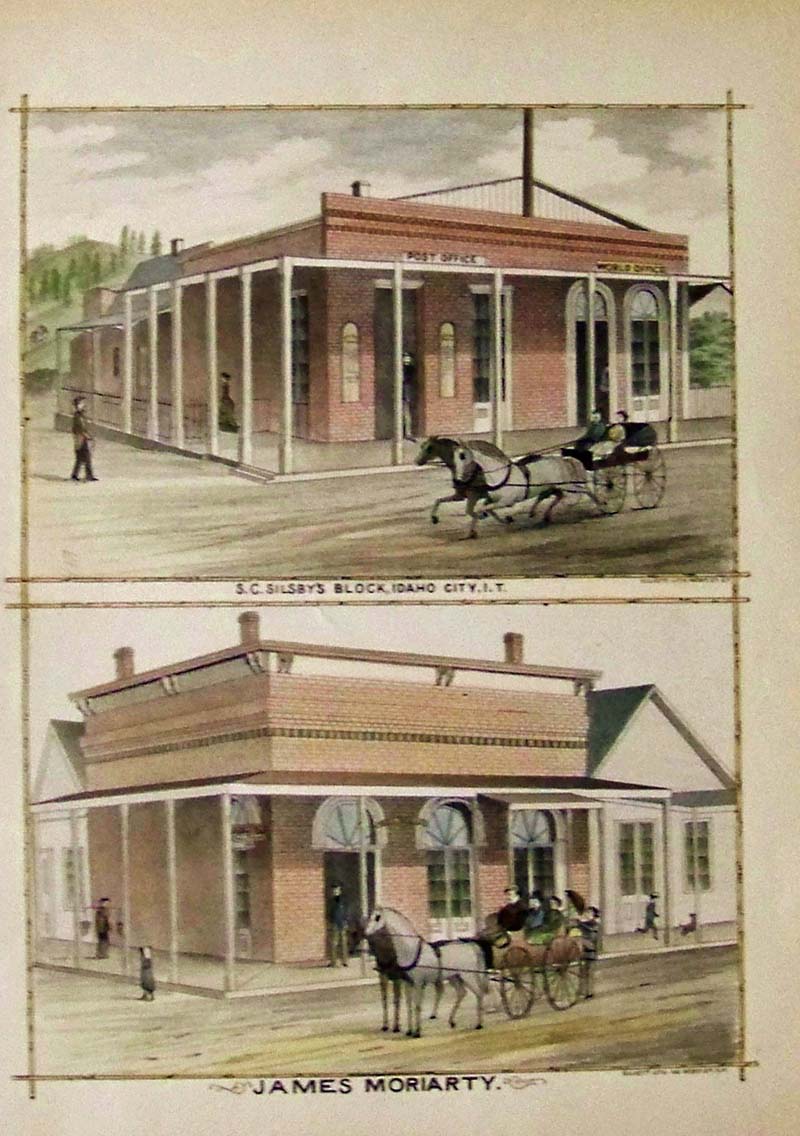 114id: 1884 Hand colored lithograph titled James Moriarty which shows the Post Office in Idaho City. 13 x 9-1/2 in. $80