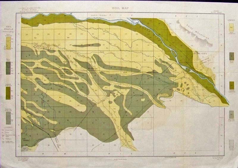 118id: 1901 Color lithograph by A. Hoen & Company showing Boise, Idaho's Soil Map with a Soil Profile outside of margins, furnished by the U.S. Department of Agriculture, Bureau of Soils by Milton Whitney, Chief. 22 x 15-1/2 in. $80