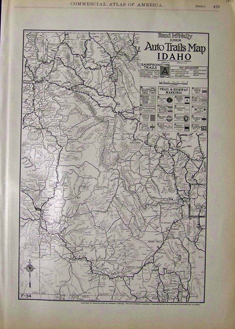 122id: 1925 Rand McNally Junior Early road map and Auto Trails Map of Idaho which show a guide to Trail & Highway Markings. 20-1/2 x 14-1/2 in. $80