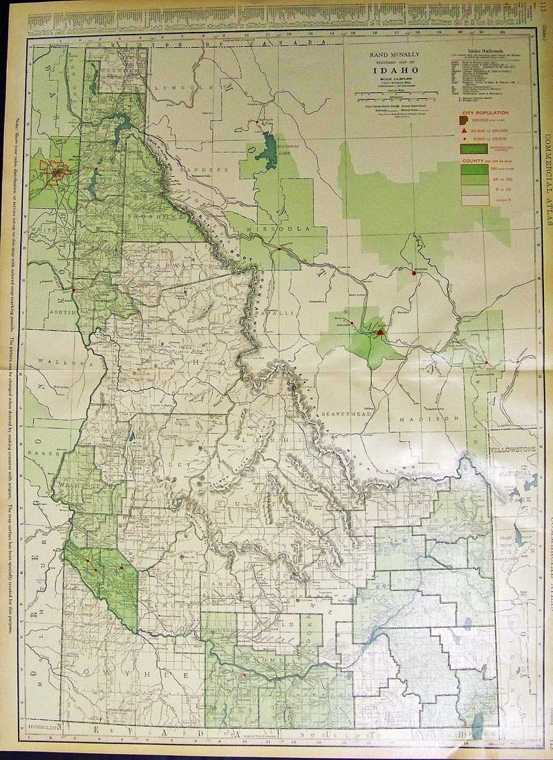 116id: 1918 Color Rand McNally Commercial Atlas Railroad Map of Idaho with a guide to Principal Cities on left and next to title in red are all the railroad lines listed. 28 x 20-1/2 in. $80 |