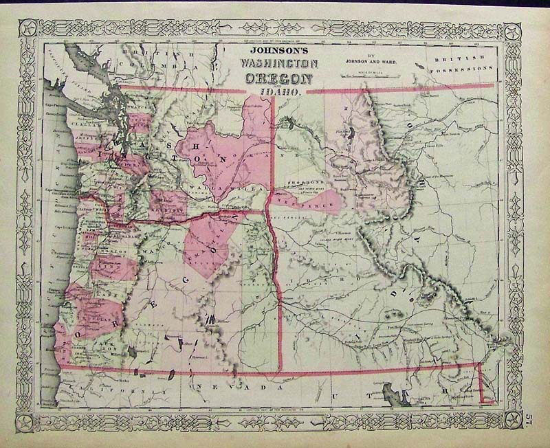 202ow: C.1860 Johnson's Washington, Oregon and Idaho hand colored engraved map. 18 x 14 in. $180