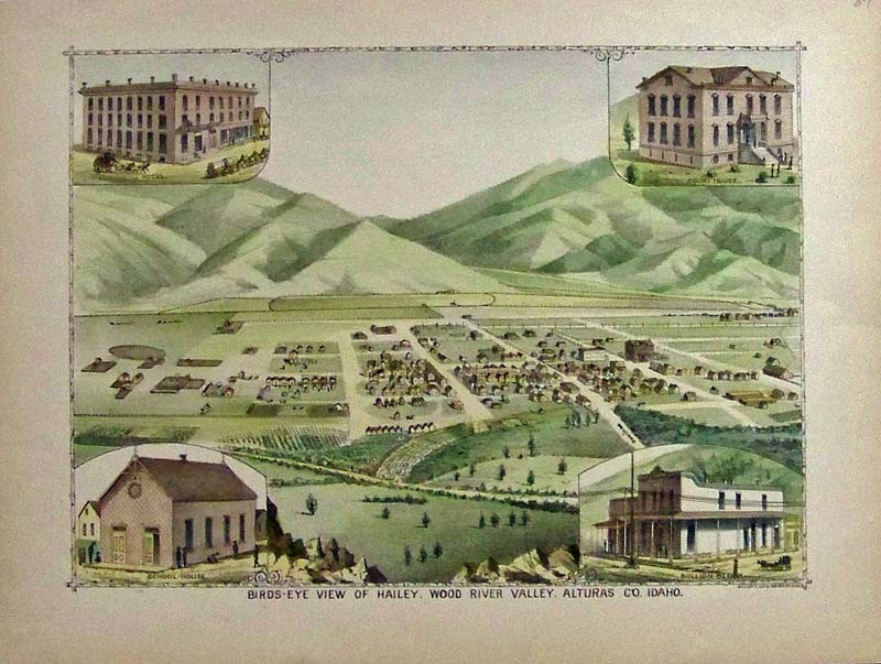 216idaho: 1894 Hand colored lithograph showing a Bird's-Eye View of Haily, Wood River Valley, Alturas Co., Idaho. Elliott Lithograph. 13-1/2 x 10 in. $60
