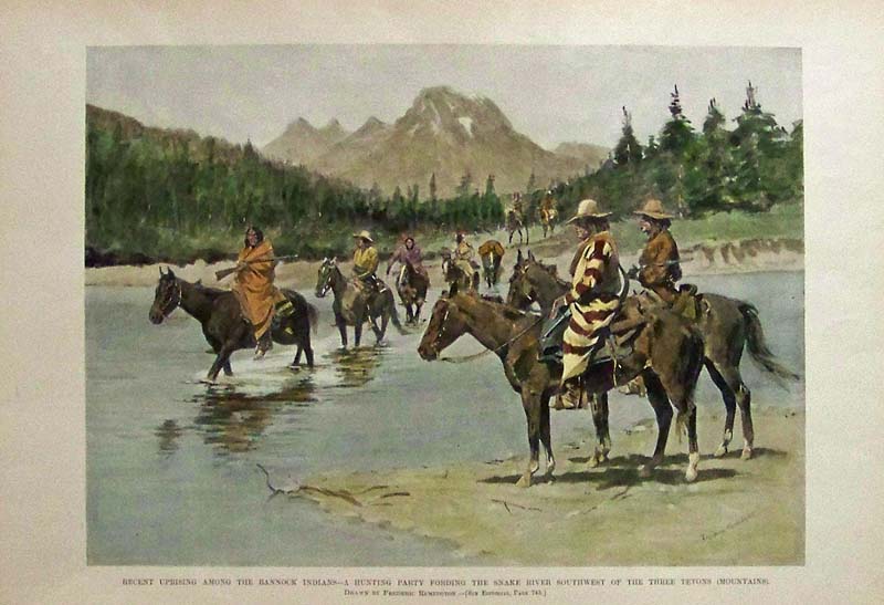218idaho: 1882 Harper's Weekly hand colored half-tone image showing the "Recent Uprising Among the Bannock Indians -- A Hunting Party Fording the Snake River Southwest of the Three tetons (Mountains." Drawn by Frederic Remington. 15-1/2 x 10-1/2 in. $60