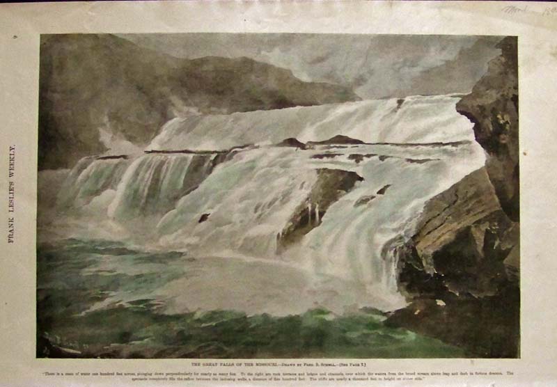 223idaho: 1894 Hand colored half-tone image showing the Great Falls of the Missouri, drawn by Fred. B. Schell. Featured in Frank Leslie's Illustrated Weekly. 16 x 11 in. $60