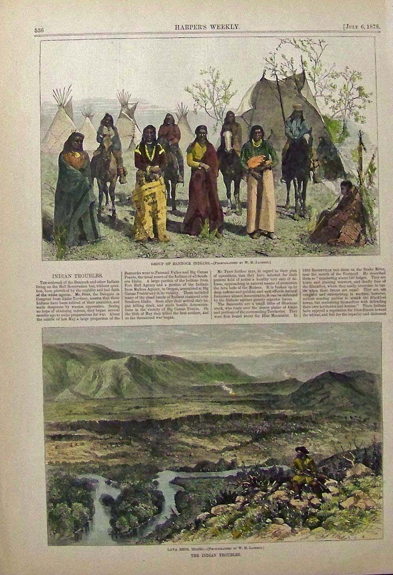 231idaho: 1878 Harper's Weekly hand colored wood engraving showing the lava beds in Idaho in a caption titled, "The Indian Troubles." 16 x 11 in. $50
