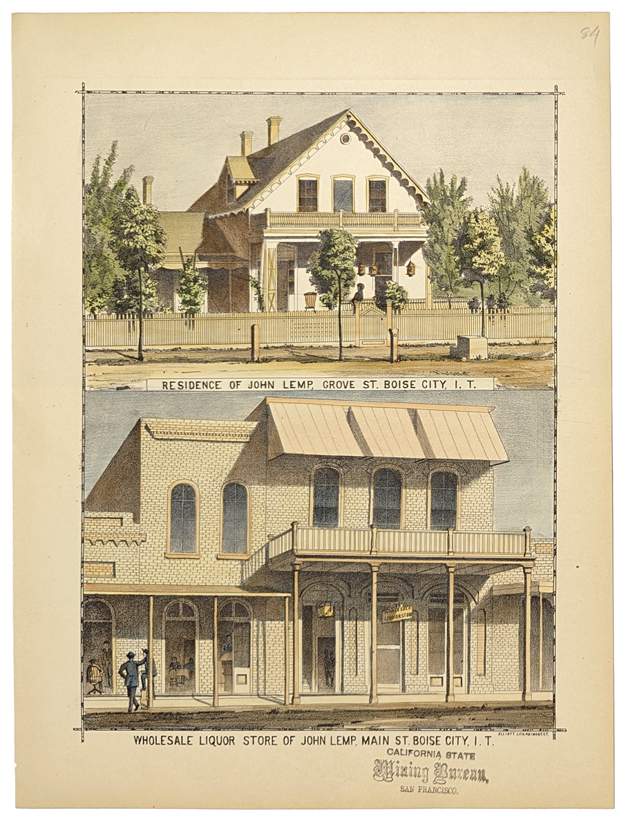 232idaho: State Seal Fancy Apples fruit label, packed and shipped by Emmett Fruit Growers Association; Emmett, Idaho. 10 x 9 in. $40 ![]() 233idaho: Nez Perces. 1855 USPRR Survey. Plate XXXIII. 8 1/2 x 11 1/2 in. $100 ![]() 235idaho: 1884 Hand colored lithograph showing the residence of John Lamp, Grove St. Boise City, I.T., bottom image showing Wholesale Liquour Store of John Lemp, Main St. Boise City, I.T. **Stamped California State Mining Bureau, S.F. 10 3/8 x 13 3/4 in. $80 . ![]() 236idaho: 1884 Hand colored lithograph showing the home of G.D. Ellis, Half mile N.W. of Boise City, Idaho. Bottom image showing the home of George Davis, Two miles west of Boise, Idaho. 9 1/2 x 13 3/8 in. $80 ![]() 237idaho: 1884 Hand colored lithograph showing G.D. Gardner's Ranch, Rynold's Creek, Idaho Terr. 10 1/4 x 13 5/8 in. $60 ![]() 238idaho: 1884 Hand colored lithograph showing Green Meadow Ranch, 6 miles N.W. of Boise, property of S.D. Aiken, Idaho. 10 1/4 x 13 3/4 in. $60 |