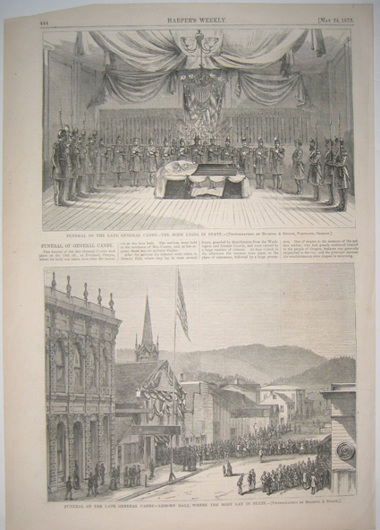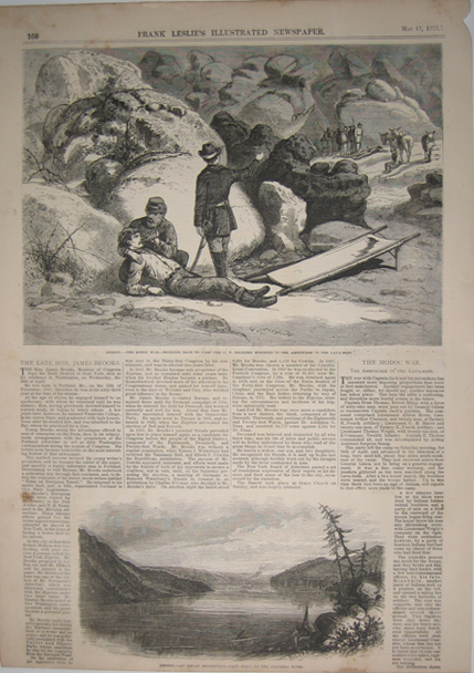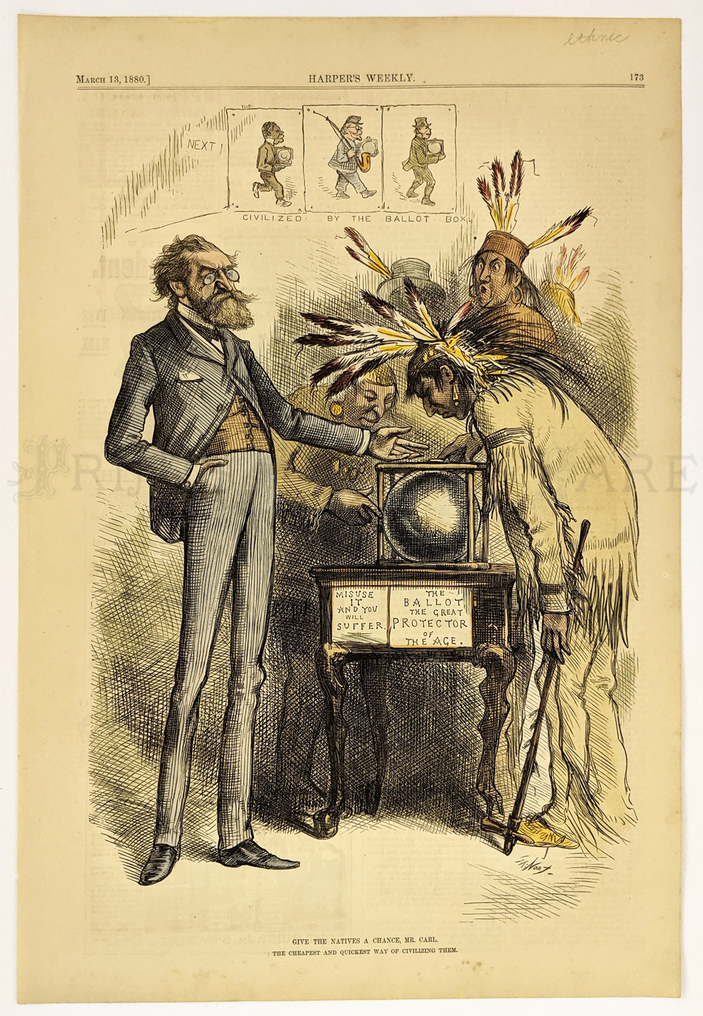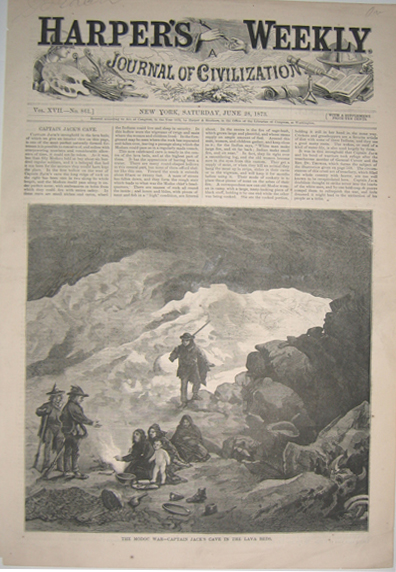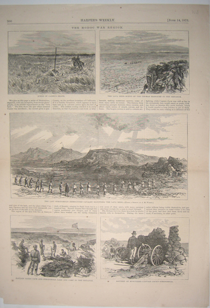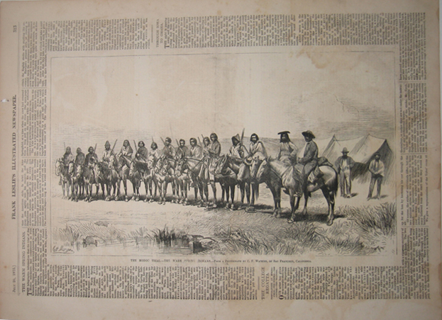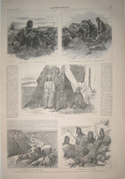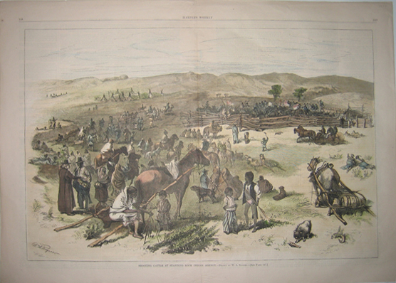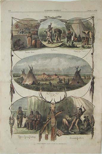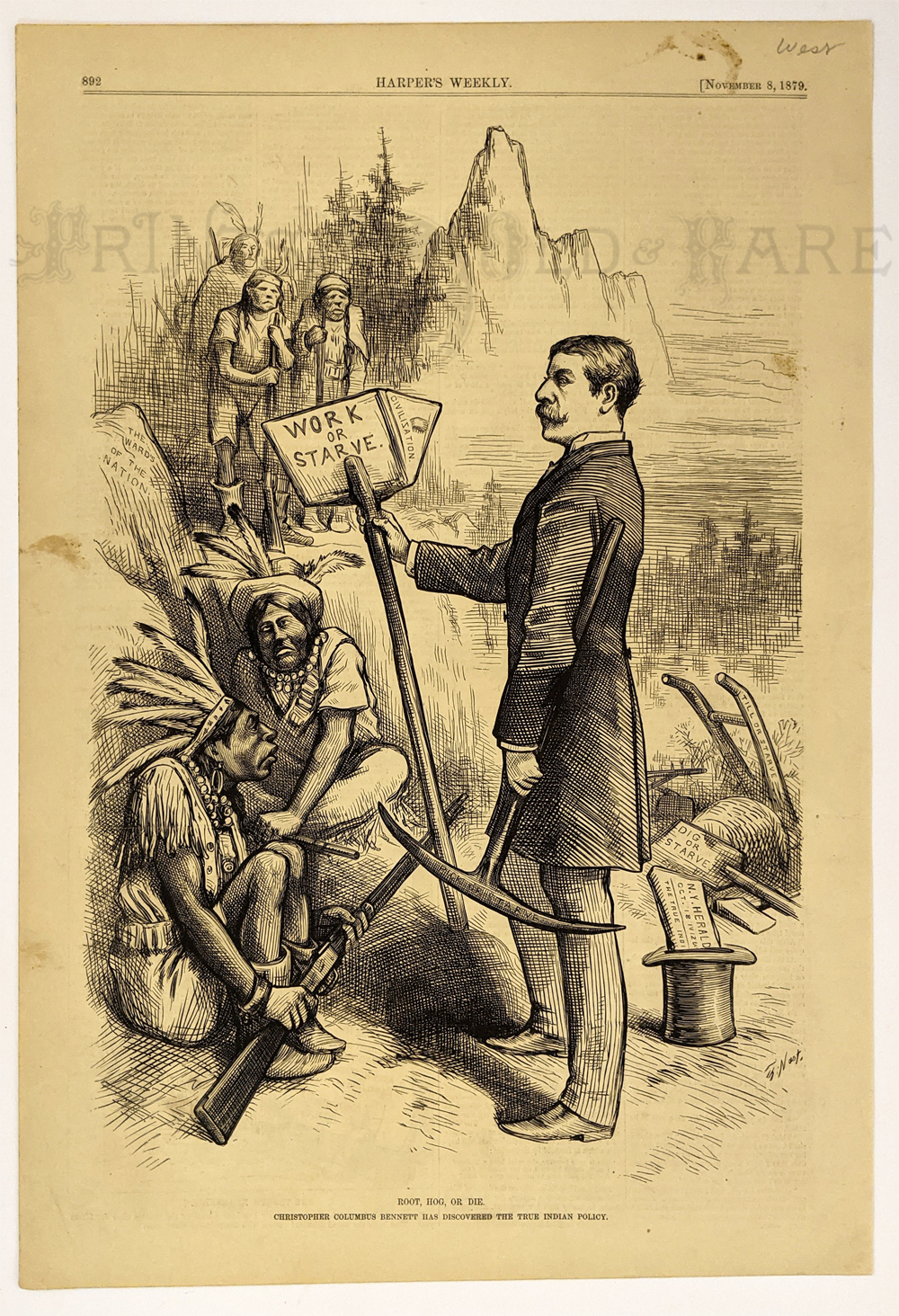 ![]() 247indn: 19th Century Government Policy! 1880 Cartoon by Thomas Nast. “Give the Natives and Chance Mr. Carl.” The cheapest and easiest way of civilizing them. Secretary of the Interior Schurz background shows 3 cartoons success. African American, German & Irish. 10 7/8 x 16 in. $60 b/w: $50 ![]() 248indn: 19th Century Government Policy! 1879 Thomas Nast cartoon showing James G. Bennett publisher of the NY Hearld showing farm equipment "Root, Hog, or Die." Wood engraving. 10 7/8 x 15 5/8 in. $45 ![]() 232indn: 1873 Oregon - The Modoc War - Bringing Back To Camp The U.S. Soldiers In The Ambuscade In The Lava-Beds AND Oregon - An Indian Rendezvous - Cape Horn, On The Columbia River. Wood engravings with text published in Frank Leslie's Illustrated Newspaper. 11x16in. $30 ![]() 234indn: 1873 The Modoc Trial - The Warm Spring Indians - From A Photograph By C.F. Watkins, of San Francisco, California. Large wood engraving with wrap-around text facing other direction, published in Frank Leslie's Illustrated Newspaper on July 26, 1873. Picture depicts a large group of Modoc indians on their horses, all standing in a line. 11x16in. $30 ![]() 235indn: 1873 The Modoc War - Captain Jack's Cave In The Lava Beds. Wood engraving with text published in Harper's Weekly, A Journal Of Civilization on June 28, 1873. Vol. XVIL - No. 861. 11x16in. $30 ![]() 236indn: 1873 Modoc Brave Lying In Wait For A Shot AND On The Look-Out For An Attack On A Picket Station AND Modoc Squaws AND Captain Jack's Late Stronghold AND Warm Spring Indians Scouting. Five wood engravings with text, titled "Pictures From The Lava Beds - From Photographs By Muybridge, Furnished By The Courtesy of Bradley & Rulofson, San Francisco," published in Harper's Weekly on June 21, 1873. 11x16in. $30 ![]() 237indn: View of the 1683 Wm. Penn's Treaty With the Indians. Beautiful Philadelphia chromolithograph by Kurz & Allison, c.1890. 28 x 22 in. $350 ![]() 238indn: 1887 Around Behring's Straits - Drawn From Photographs By Harry Fenn. Eleven hand colored wood engravings on one page published in Harper's Weekly on February 12, 1887. Each scene captioned as follows: Old Russion Church, S'Michaels; Woman Of Point Barrow; Indian Oomlak, Wood Frame Covered With Walrus Hide; Oomalik Chief, Point-Hope; Fur Seals at St. Paul's Island; Dog sled, Indian Point, Siberia; Indian Summer Rendezvous at Sheshalik Kotzebue Sound; Native Houses, Plover Bay, Siberia, Covered With Walrus Hide; House of Point Hobe, Oomatik; Skin Covered Fishing Canoes; and Natives At Sheshalik Kotzebue Sound. 16x22in. $150 ![]() 239indn: 1879 Shooting Cattle At Standing Rock Indian Agency - Drawn By W.A. Rogers. Hand colored wood engraving published in Harper's Weekly on February 22, 1879. Scene depicts a group of indians shooting cattle in a pen in the background, and in the foreground, indians tending to their families. 16x22in. $150 ![]() 242indn: 1873 Double-page hand colored wood engraving featured in The Illustrated London News titled, "The Lava Beds, Lake Tule, California, The Scene of the Modoc Indian War." 22 x 16 in. $180 ![]() 243indn: 1875 Color lithograph titled, "Toro-Mucho, Chief of a Band of Kioways," from the Colorado Exploring Expedition. 11 x 9 in. $120 ![]() 244indn: 1875 Hand colored lithograph titled, "Chemehuevis," from the Colorado Exploring Expedition. 11 x 9 in. $120 SEE OUR OLD WEST AND WESTERN COWBOY MATERIAL |