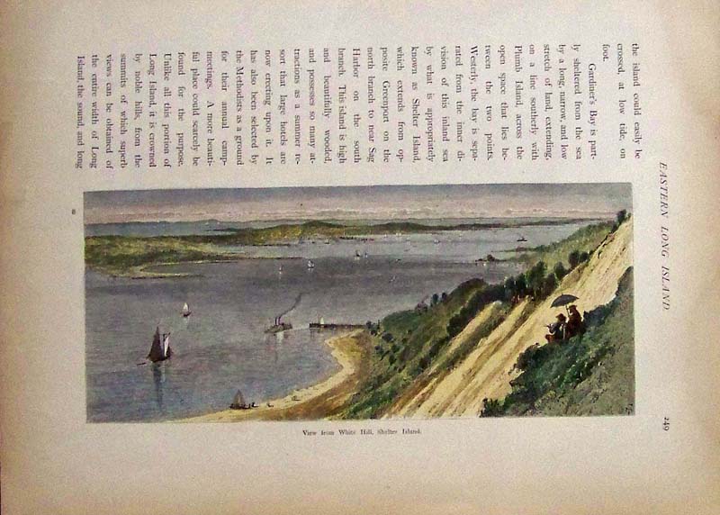 ![]() 131lni: 1857 - Southern Tip of Long Island/Block Island. Hand colored lithograph showing the Montauk area and Block Island. Beautiful Survey of the Coast of the United States by A.D. Bache. Vignettes on bottomwhich include Montauk lighthouse. 36 x 26-1/2 in. $500 ![]() 132lni: 1924 Commercial Atlas of America, The Rand McNally Black and White Mileage Map of Connecticut, Massachusetts and Rhode Island 27.5x20.5 in. $50 ![]() 134lni: 1873 Hand colored wood engraving with text describing "Scenes in Eastern Long Island. Image is of Sag Harbor. 12-1/2 x 9-1/2 in. $30 ![]() 139LongIsland: A.B. Frost hand colored half-tone showing people fishing from a boat. 15 x 10-1/2 in. $60 ![]() 140LongIsland: Hand colored half-tones showing Snap-Shots of the Recent Beagle Trials on the Estate of the Late W.C. Whitney at Westbury, Long Island. 13 x 9 in. $60 ![]() 142LongIsland: Hand colored wood engraving from Eastern Long Island titled, "View from White Hill, Shelter Island." Text on top of page. 12-1/2 x 9-1/2 in. $30 ![]() 143LongIsland: Harper's Weekly hand colored half-tones showing views surrounding Polo at the Meadowbrook Club, Long Island. 15-1/2 x 10 in. $80 ![]() 144LongIsland: 1885 Hand colored wood engraving from Frank Leslie's Illustrated Newspaper titled, "New York -- The Rockaway Fall Steeplechases -- A Day at Cedarhurst, L.I." 15-1/2 x 11 in. $80 ![]() 145LongIsland: 1880 Hand colored wood engraving from Harper's Weekly titled, "The New Summer Resort at Long Beach." Drawn by W.P. Snyder. 16 x 11 in. $90 ![]() 146LongIsland: 1883 Harper's Weekly hand colored wood engraving titled, "Sands Point, Long Island." Drawn by Charles Graham. 16 x 11 in. $60 See also: NEW YORK New York City Saratoga, NY Albany, NY Rochester, NY Buffalo & Niagara Falls, NY Brooklyn, NY |