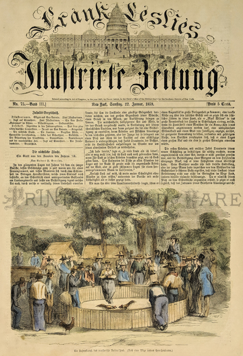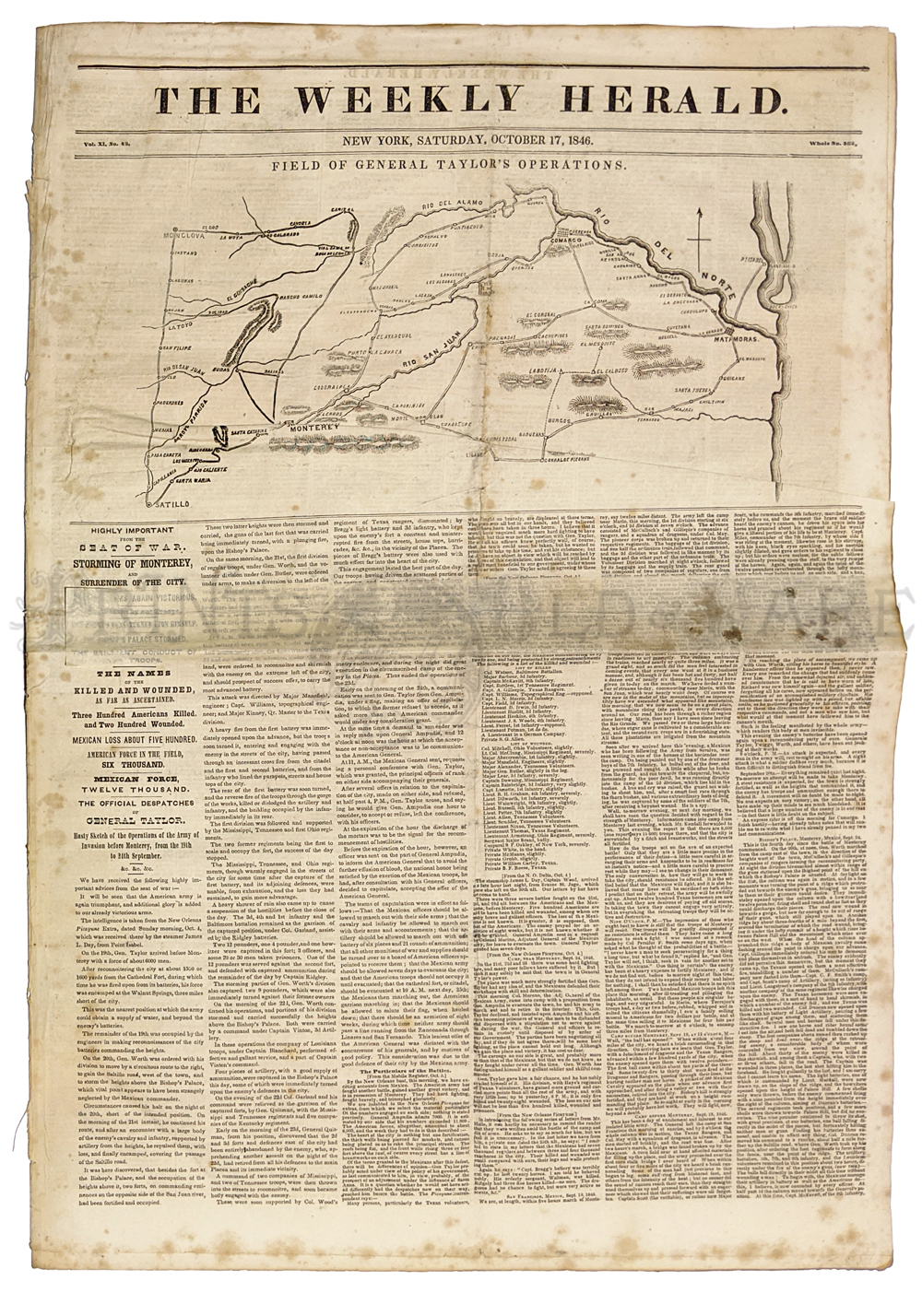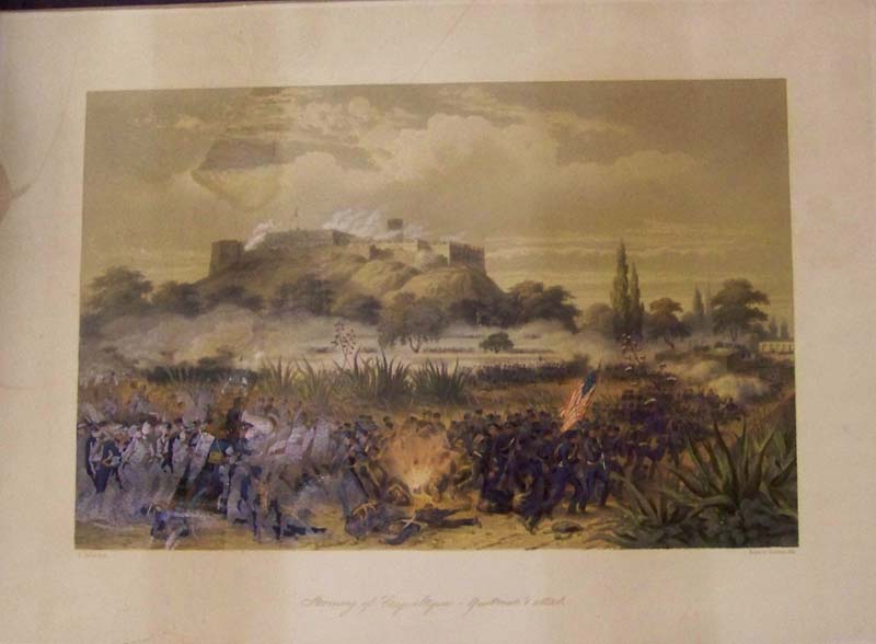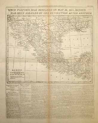 ![]() 011fpm: Colton’s Mexico. New York: G.W. & C.B. Colton & Co., 1883. Separately issued map on banknote paper, folding into original covers. Lithograph. Hand colored. Excellent condition. 12 1/2 x 15 1/4 in. $650 ![]() 004SanFrancisco: Apache Warrior Victorio, died near border. 1880 San Francisco Illustrated Wasp "Semi-Tropical Impudence." An amused Uncle Sam leans over border fence as the Mexican Government asks for money to help defeat Victorio. Victorio pictured as a dead wild boar. Chromolithograph Wasp Cover. 14 x 10 1/4 $150 ![]() 105mex: 1859 German issue of Frank Leslie's Illustrated Weekly hand colored wood engraving showing a cock fight in a ring as spectators watched. 15-1/2 x 11 in. $50 ![]() 106mex: 1859 Colton's Mexico. Showing the towns, counties, Gulf of Mexico and Gulf of California. Small inset of the Territory and Isthmus of Tehuantepec. Hand colored, lithograph. 14 x 17 in. $110 ![]() 107mex: Mexican War 1846. "Field of General Taylor's Operations." Map of Montery & Vicinity. Front page Weekly Herald. Long article on storming and surrender of Monterey. 8pp total - also includes portrait and article on Zachary Taylor. 11 1/2 x 22 in. $45 ![]() 108Mexico: Mexico City - c.1860. Zocalo. The center of historic area including a magnificent Cathedral. Hand colored, steel engraving. 10 1/4 x 7 3/8" in. $75 ![]() 102mex: 1875 Mexico: Indian Houses by Railroad Line. Hand colored engraving, published in 1875 as an illustration to a book. Title is "Huts of the Native Indians on the Road Between Vera Cruz and Mexico." The huts are situated within several feet of the railroad track. 9x11 in. $30 ![]() 103mex: Beautifully hand colored steel engraving. Published by Herrmann J Meyer in Meyer's Universum c 1850. Picture titled, Mexico. 7.5x10 in. $75 ![]() 104mex: 1848 Hand colored lithograph showing C. Nebel's "Storming of Chapultepic -- Quitman's Attack" during the Mexican-American war in Mexico City. Entered According to Act of Congress stamped on bottom lefthand corner of lithograph. C. Nebel fecit. lr: Bayot et Bichebois lithograph. Slight discoloration upper left of image and border. 21 x 15 in. SOLD |