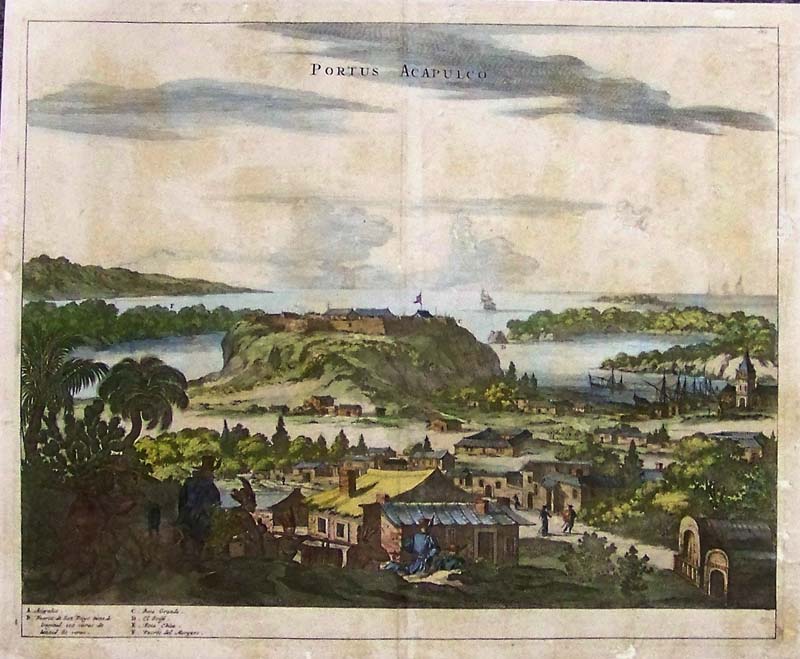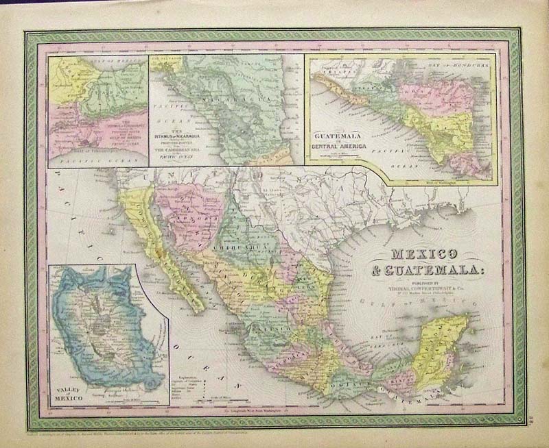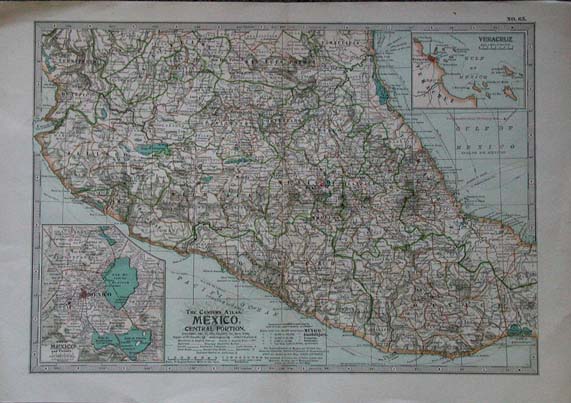 ![]() 013mex: 1916 Newspaper Map of Mexico. With text regarging revolution and changes of government in previous five years. 22x17-1/2 in. $40 ![]() 015mex: The Century Atlas, Mexico, Central Portion, published in 1897. Printed in color by Centuty, this very detailed map has insets of the Mexico City area and one of Veracruz. 17x12 in. $40 ![]() 016mex: 1886 Hand colored wood engraving from Harper's Weekly titled, "Mount Popocatepetl," the volcano, originally photographed by W.H. Jackson & Co., Denver, Colorado. 22 x 15-1/2 in. $60 ![]() 017Mexico: 1850 Cowperthwait hand colored Mexico and Guatemala map with insets of the Isthmus of Nicaragua, the Valley of Mexico which is Mexico City now. Also shows Texas as a Republic. 17 x 13-1/2 in. $500 ![]() 018Mexico: 1856 Puebla, Mexico city hand colored lithographed map showing street names, principal buildings, institutions, ranches, and fortifications. An index on the left side of map shows the explanation of the various places. Relief shown by hachures. scale. Map created by Jose Justo Alvarez in Mexico. 24 x 18 in. $275 ![]() 020mex: Portus Acapulco circa 1750, With Shipping in Wide Landscaped View. A rare and unusual copper engraved print of the port of Acapulco, shows Spaniards, with Aztec helpers descending into the port of Acapulco, many buildings of the time depicted along with sailing ships and the port with church and moored sailing vessels. Legend depicts, a. Acapulco, b. Fuerca (fort,) c. Boca Grande, d. El Grifio, e. Boca Chica, f. Puerto del Marques. Wonderful rendition of the time and style of dress of Aztecs (maybe) and Spaniards on horseback. Petrus Montanus, Del J. Ogliby S. C. Publisher 1670 London. Condition: Very good, some missing paper on outside margins and in the middle of image above horizon, normal browing and yellowing with age. Rare copper engraving, colored. 13.6 x 10.3" re-margined, enhanced color and mounted on background paper. $500 with backing. ![]() 021mex: 1810 Map of the Valley and City of Mexico Oltmann. A small and very finely detailed and engraved map and hand colored example of the English edition of Humboldt's map of the Valley of Mexico, with Mexico City at the center, which appeared in Political Essay on the Kingdom of New Spain. Containing Researches Relative to the Geography of Mexico, from the English edition of Humboldt's monumental work, published by Longman and Co. Condition: small fold on right side, good margin with some aging color at margins. size, 10.5 x 8.5 image. SOLD ![]() 101mex: 1861 Johnson Map of Mexico. Hand colored, engraved map of Mexico, published in 1861 by Johnson and Ward. Each state within the country is separately colored. In the bottom left corner, there is a small map of the territory and isthmus of Tehuantepec. Above Mexico's northern border, the US territory of New Mexico is shown extending from California to Texas. 14x18 in. $90 |