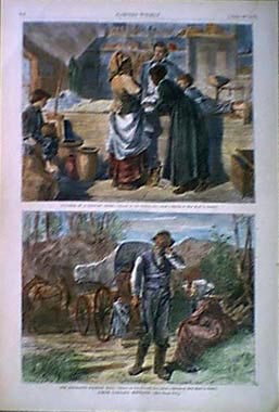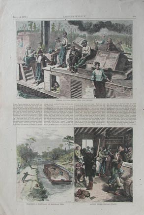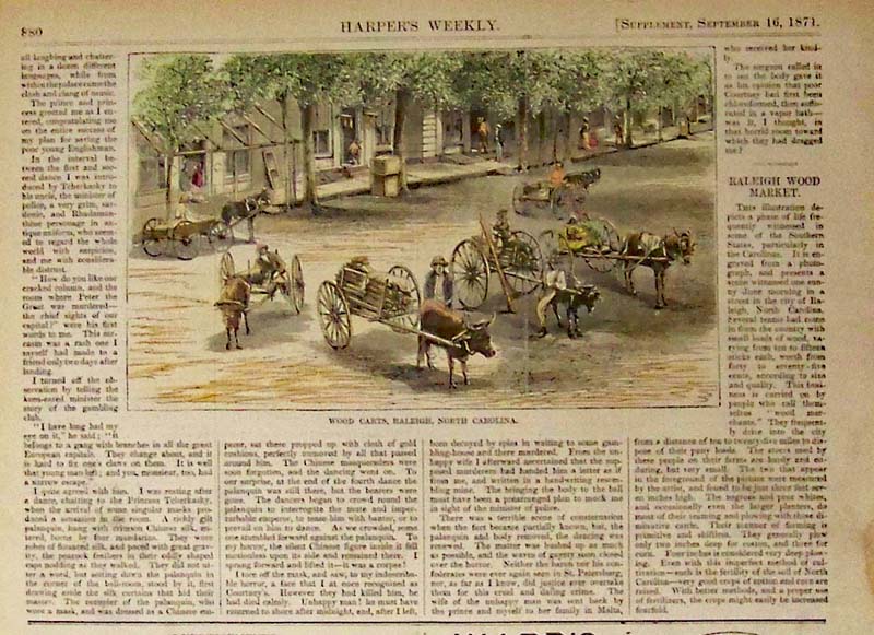 003nc: 1872 North Carolina scenes. Blacks in country store and immigrants. Hand colored, two views on one page. Harper's. 11x16 in. $60 007nc: 1873 North Carolina 'Sketches in The Dismal Swamp.' Three authentic hand-watercolored antique engravings on one page, plus descriptive text from original Harper's Weekly published in 1873. Lake Drummond; Going into the Swamp-A check on the Tow; and The Lone House. Genuine antique produced in 1873 - NOT a reproduction! 16x11 in. $50 011nc: 1879 North Carolina. Five views on one page titled, "Charcoal Burning." Hand colored engravings from Harper's Weekly dated December 27, 1879. 11x16 in. $50 ![]() 012nc: 1871 Wood Carts, Raleigh, North Carolina. Hand colored wood engraving from Harper's Weekly. 11 x 7-1/2 in. $40