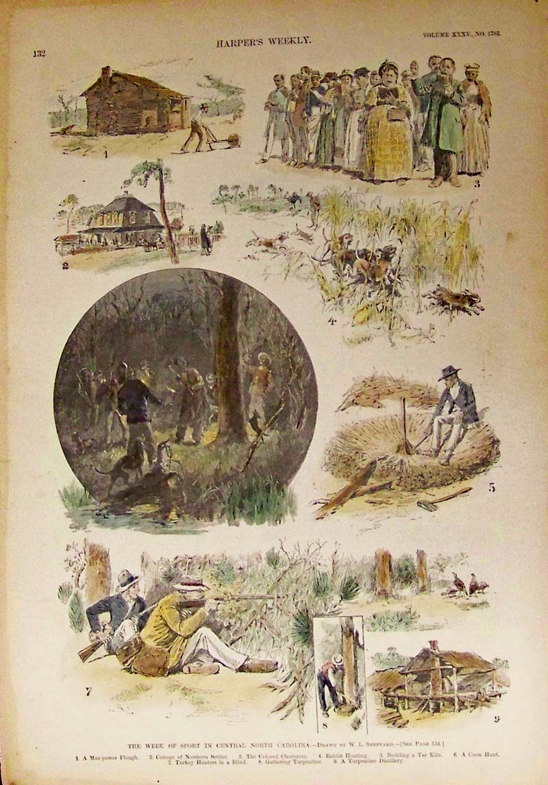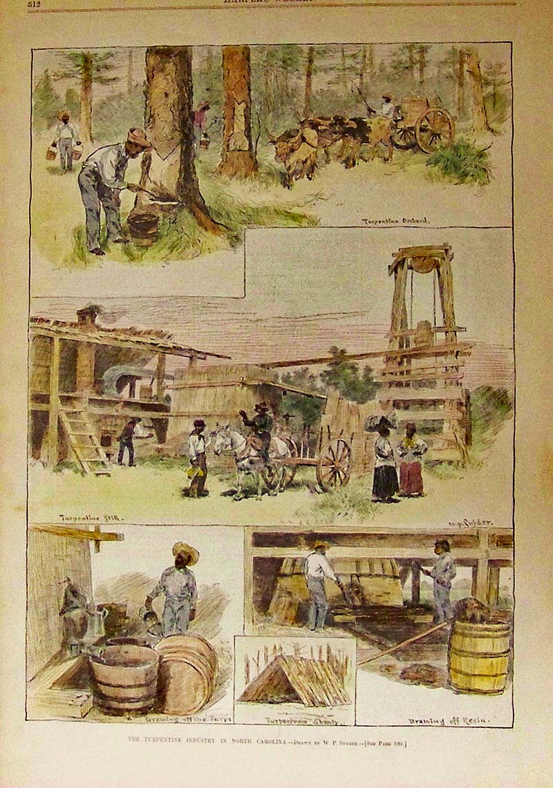 013nc: 1884 The Turpentine Industry in North Carolina. Hand colored wood engraving featured in Harper's Weekly. 15 x 11 in. $60