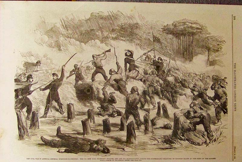 014nc: 1862 The Civil War in America - General Burnside's Expedition: The 9th New York (Hawkin's Zouaves) and the 21st Massachusetts Taking the Confederate Fieldwork on Roanoke Island at the Point of the Bayonet. Wood engraving featured in The Illustrated London News. 15-1/2 x 10-1/2 in. $50