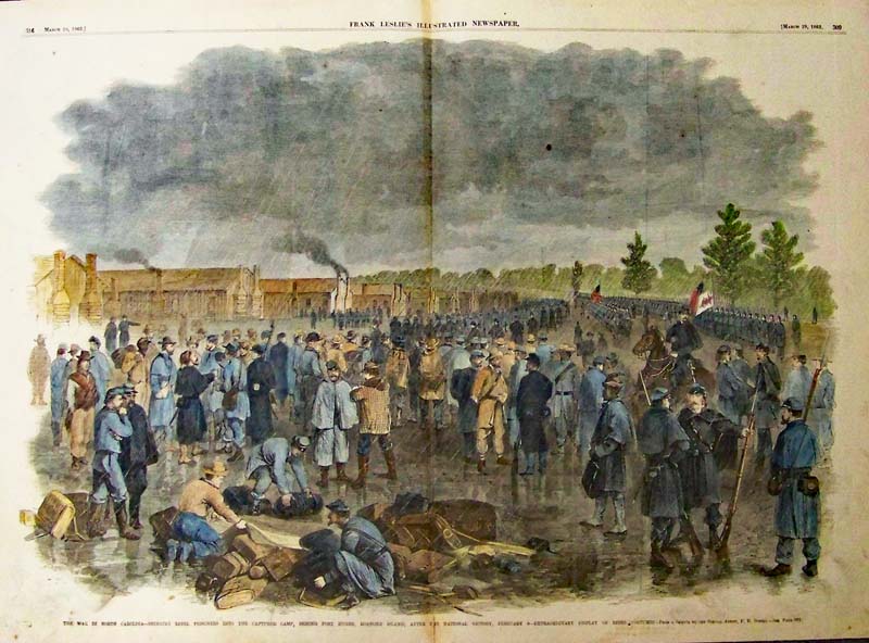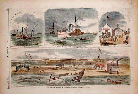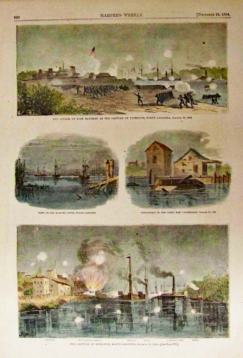 015nc: 1864 The Capture of Plymouth, North Carolina, October 31, 1864. Harper's Weekly hand colored wood engravings. 15-1/2 x 10-1/2 in. $50