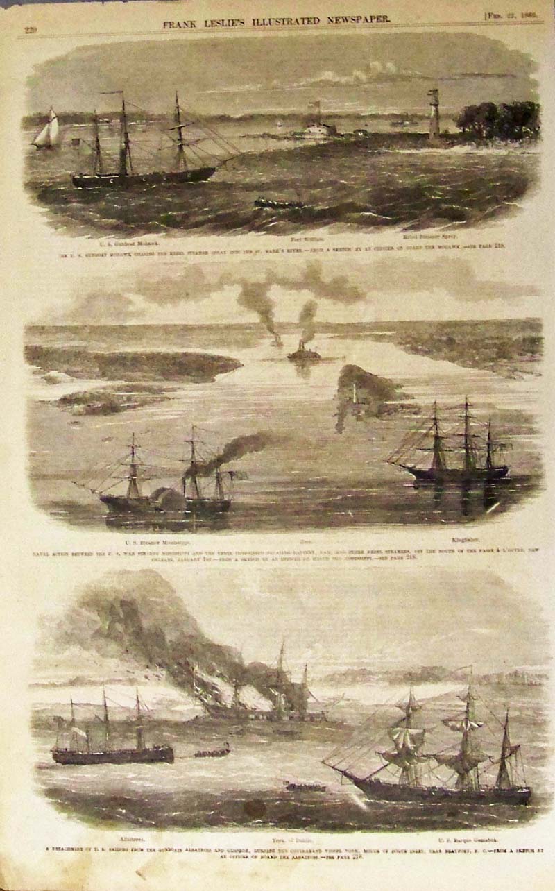 016nc: A Detachment of U.S. Sailors from the Gunboats Albatross and Gemsbok, Burning the Contraband Vessel York, Mouth of Bogue Inlet, Near Beaufort, N.C. Wood engravings featured in Frank Leslie's Illustrated Newspaper. 16 x 10 in. $50