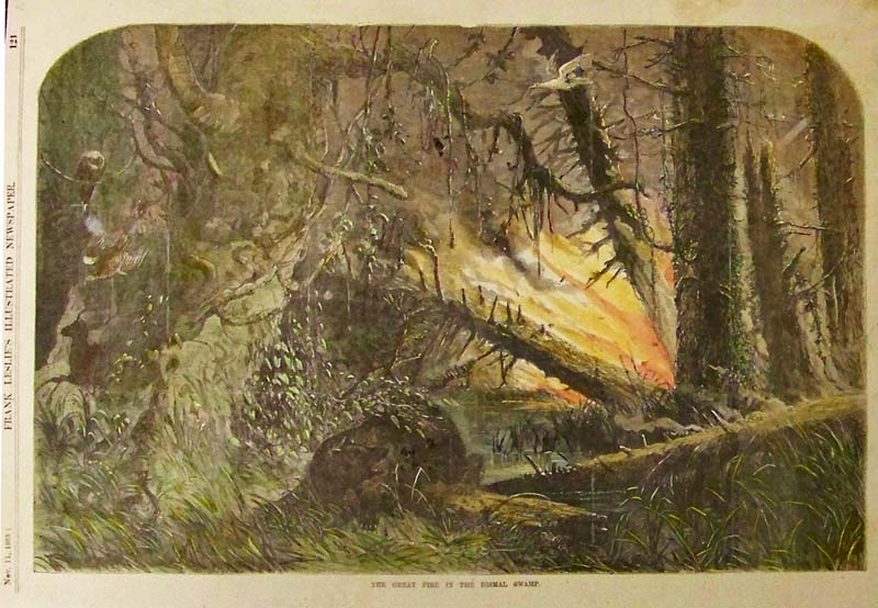 018nc: 1865 The Great Fire in the Dismal Swamp. Hand colored wood engraving from Frank Leslie's Illustrated Newspaper. 15 x 10-1/2 in. $60