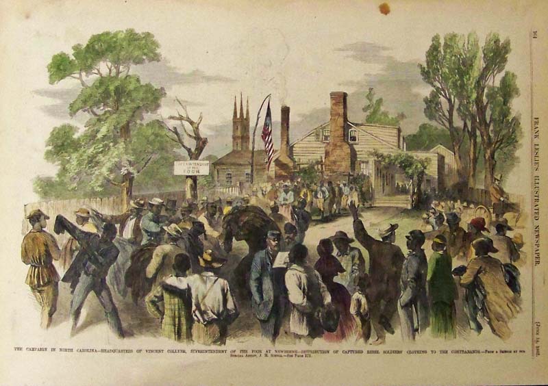 019nc: 1862 The Campaign in North Carolina -- Headquarters of Vincent Collyer, Superintendent of the Poor at Newberne -- Distribution of Captured Rebel Soldiers' Clothing to the Contrabands. Hand colored wood engraving featured in Frank Leslie's Illustrated Newspaper. 16 x 11 in. $60