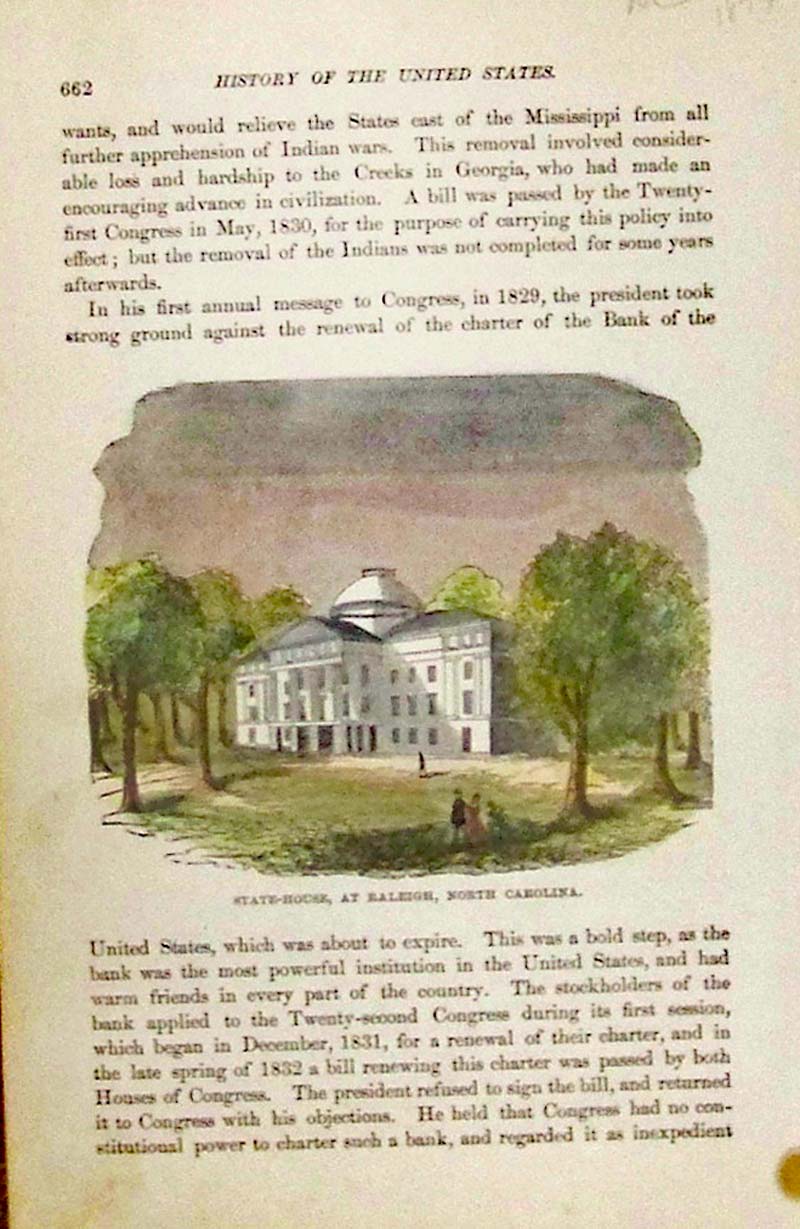 024nc: 1877 State-House at Raleigh, North Carolina. Hand colored wood engraving featured in the History of the United States. Text surrounds image. 8-1/2 x 5-1/2 in. $30