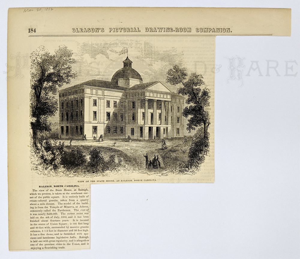 025nc: 1855 View of the State House at Raleigh, North Carolina. Hand colored wood engraving featured in Gleason's Pictorial Drawing-Room Companion. 9-1/2 x 8 in. $40