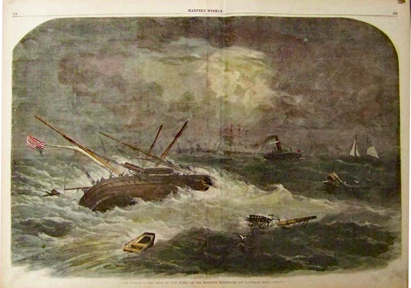 027nc: 1862 The Wreck of the "City of New York," of the Burnside Expedition, Off Hatteras Inlet. Hand colored wood engraving featured in Harper's Weekly. 22 x 16 in. $120