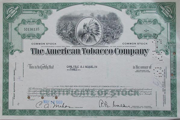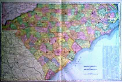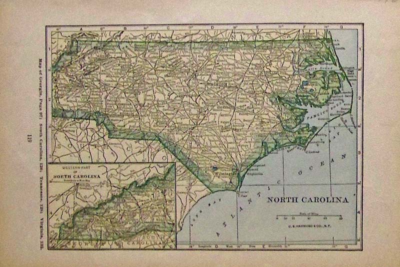 212nc: The American Tobacco Company Stock. 3 shares of Common Stock from 1969. Very decorative, with a portrait of an Indian over a view of a tobacco field in the top center. 12x8 in. $30 ![]() 213nc: 1927 Color North Carolina map which also has an inset of the Western Part of South Carolina. Published by C.S. Hammond & Co., N.Y. 9-1/2 x 6 in. $40