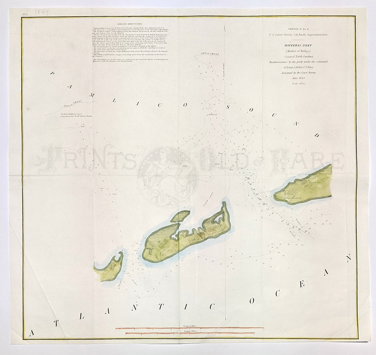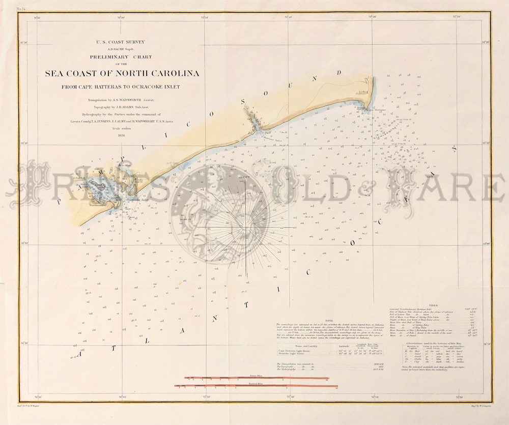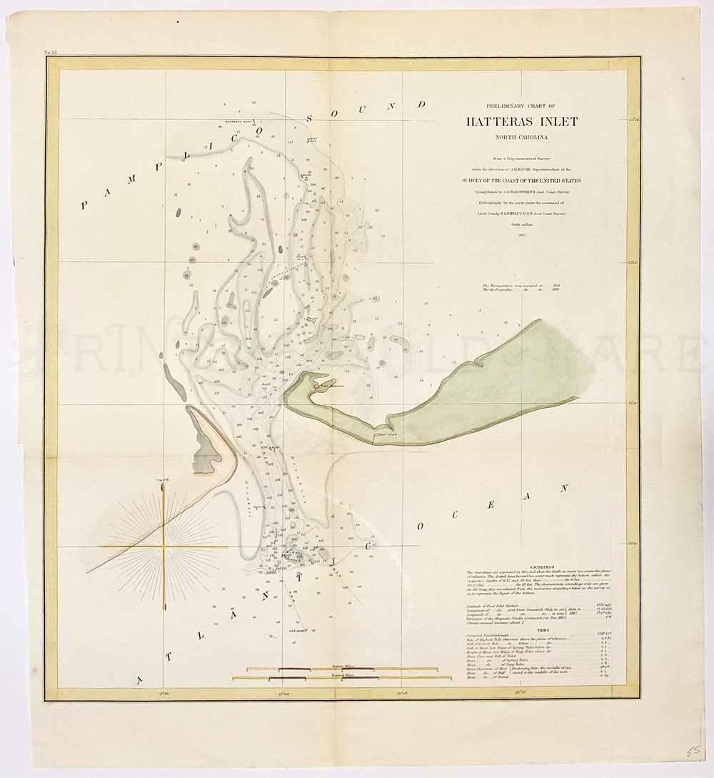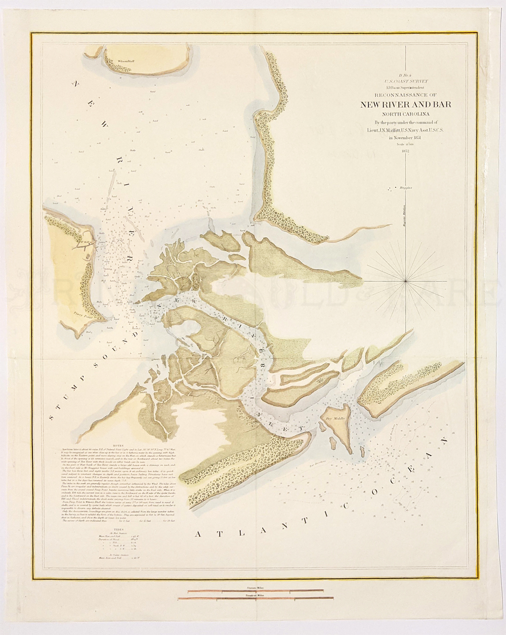 214nc: 1851 Hand colored lithographed U.S. Coast Survey by A.D. Bache, Reconnaissance of New River and Bar, North Carolina, by the Party under the Command of Lieut. J.N. Maffitt, U.S. Navy Asst. U.S.C.G. There's a Notes and Tides guide bottom left side. 18-1/2 x 15 in. $180