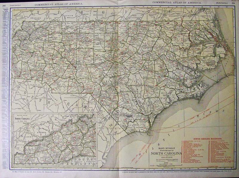 215nc: 1925 Color engraved North Carolina Railroads map featured in the Commercial Atlas of America. Rand McNally, Standard Map of North Carolina, with inset of the Western Portion of North Carolina on Same Scale. This is a County Outline Map which also shows county boundaries and county names. 28 x 20-1/2 in. $90 |