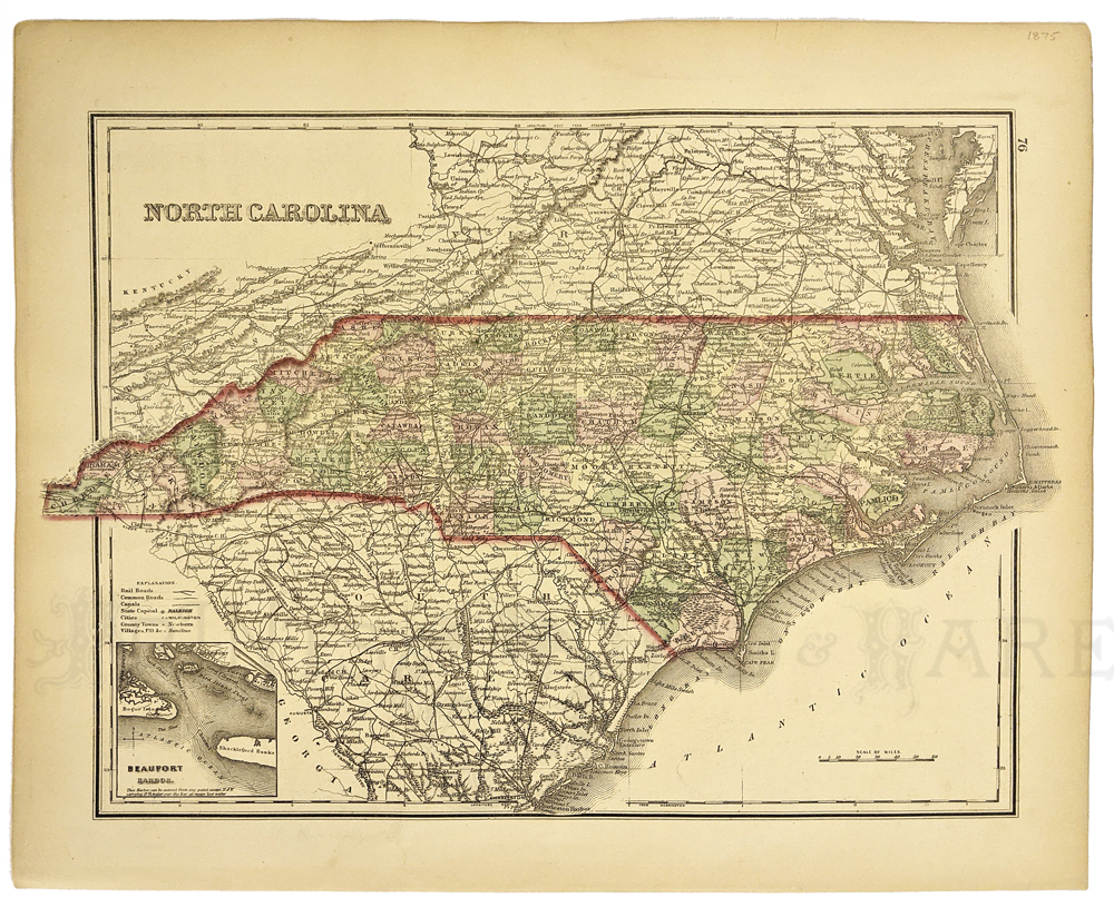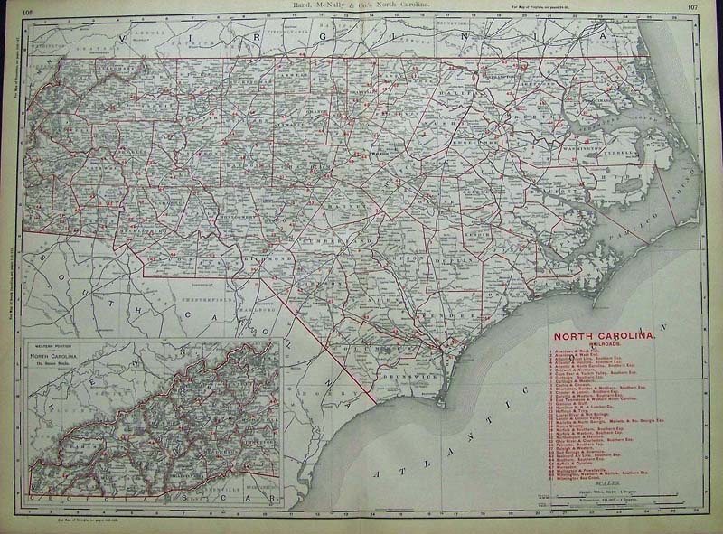 ![]() 226nc: C.1865 Hand colored steel engraving showing "Newbern," which was an important Civil War battle. Fine condition. 9-1/2 x 6-1/4 in. $80 ![]() 227NorthCarolina: 1892 Rand, McNally & Company's North Carolina red outlined Railroads Map with inset bottom left of the Western Portion of North Carolina on the same scale. Railroads key on bottom right of map. 27 x 20-1/2 in. $250