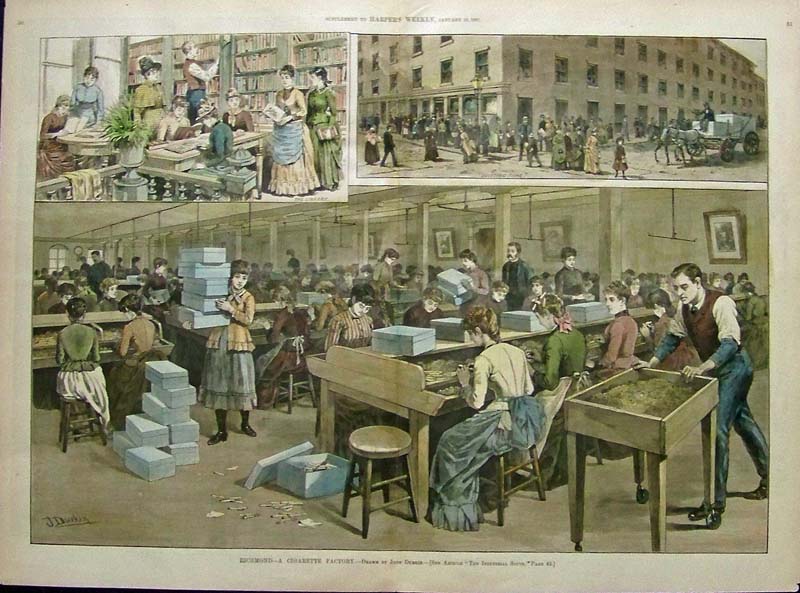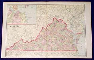 ![]() 001rm: 1887 RICHMOND VIRGINIA CIGARETTE FACTORY. 1887 double page woodcut engraving of scenes in a Richmond cigarette factory. Contains two small scenes at top: "The Library," and "Quitting Time." Large scene at bottom shows women and girls rolling cigarettes inside the factory. Harper's. 22x16 in. $120 ![]() 004rm: 1834 Richmond Episcopal Church. A hand colored rare steel engraving of the church. 11x8-1/2 in. $40 ![]() 010rm: Richmond Civil War views. Sepia tone images of the Civil War in the Richmond area. Eleven views on one large page, produced by the US Government after the War. 29x18 in. $80 ![]() 011rm: 1865 Richmond Mass Meeting. Black & white engraving of gathering at the State Capitol, August 29,1865. Interesting full page from Harper's. 16x11 in. $30 ![]() 101rm: 1888 Richmond VA Exposition Print. Hand colored engraving from Harper's Weekly, titled "The Great Industrial and Agricultural Exposition at Richmond, Virginia." Contains a collage of images from the exposition, which contained many relics of Virginia history. 11x16 in. $60 ![]() 103rm: 1899 Sheet Music: Green Fields of Virginia. This is the sheet music to a song titled "Mid the Green Fields of Virginia (In the Vale of Shenandoah)." Image in the center of the cover shows a farmer plowing a field with two oxen. The name of a previous owner is written in old fashioned ink at the top of the cover. 10x14 in. $30 ![]() 104rm: Civil War Richmond VA Bird's-Eye View. Hand colored engraving, published in Harper's History of the Great Rebellion, showing the area around Richmond as it looked in June of 1864. Important landmarks are numbered, and named below the image. 11x16 in. $60 ![]() 106rm: 1853: George Washington Statue, Richmond VA. Hand colored engraving from Gleason's Pictorial, showing the equestrian statue of George Washington which had recently been erected in Richmond. Text on either side of the image describes the statue.11x16 in. $60 ![]() 107rm: 1863 Richmond Civil War Libby Prison View. Two hand-colored engravings from Harper's Weekly, showing locations of imprisoned Union soldiers in Richmond Virginia. Top image is titled "Exterior View of the Libey Prison, Richmond, Virginia." Bottom is "Encampment of Union Prisoners at Belle Isle, Richmond Virginia." 11x16 in. $60 ![]() 111rm: 1907 Map of Virginia. Colorful map of Virginia, published in 1907 by the George F. Cram Co. Each county is colored separately. Cities, towns and railroad lines are shown. An inset map of the area around Norfolk is in the upper left corner. 14x22 in. $50 |