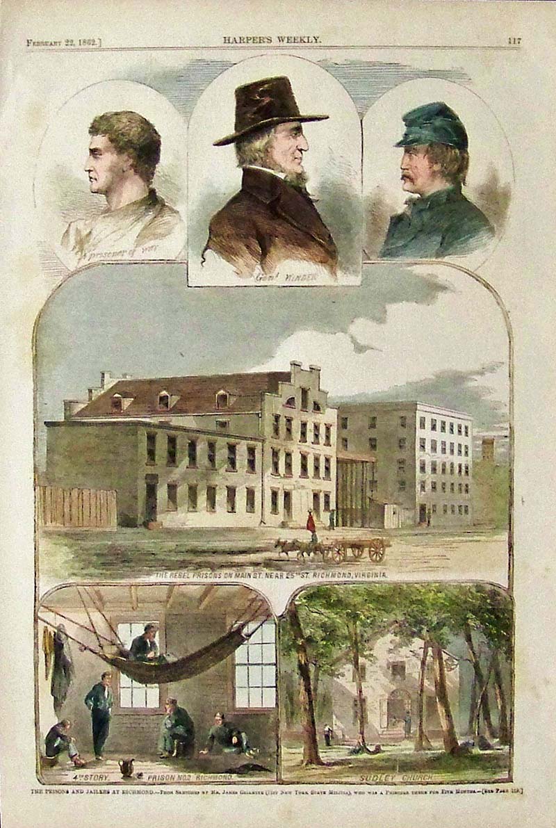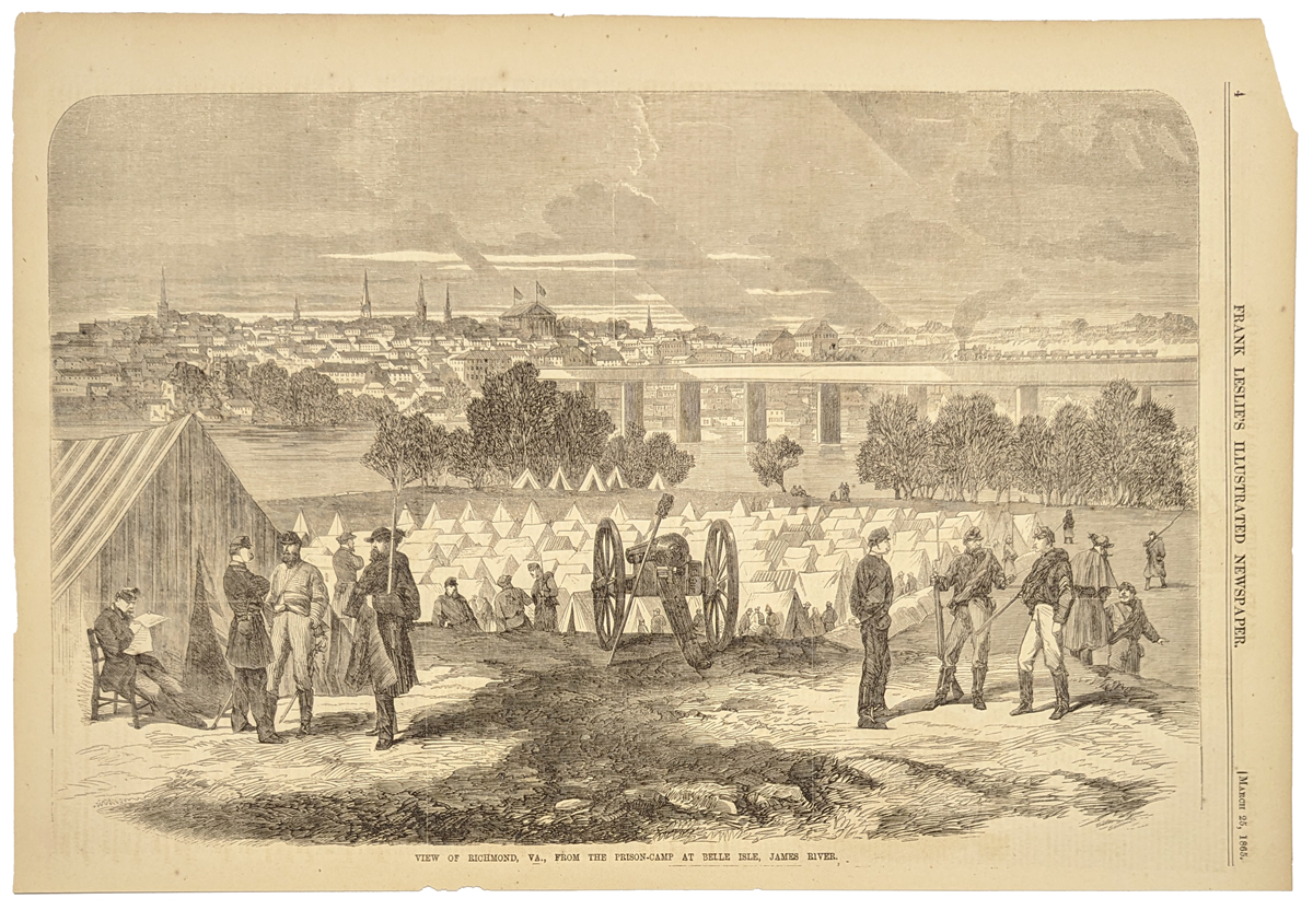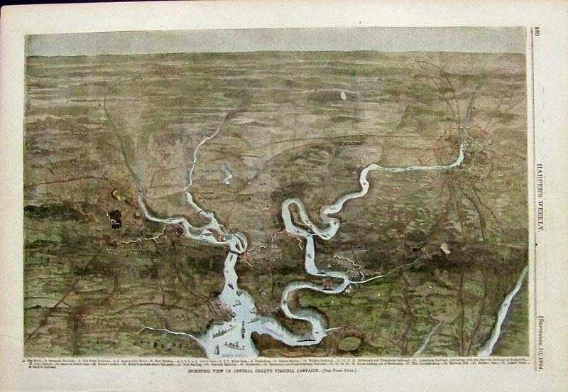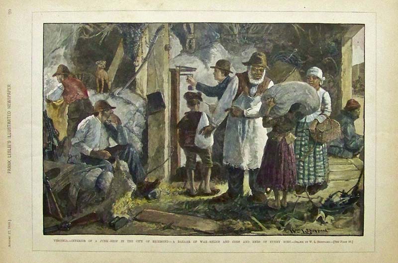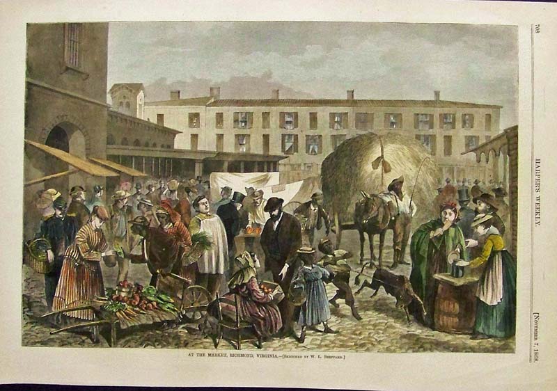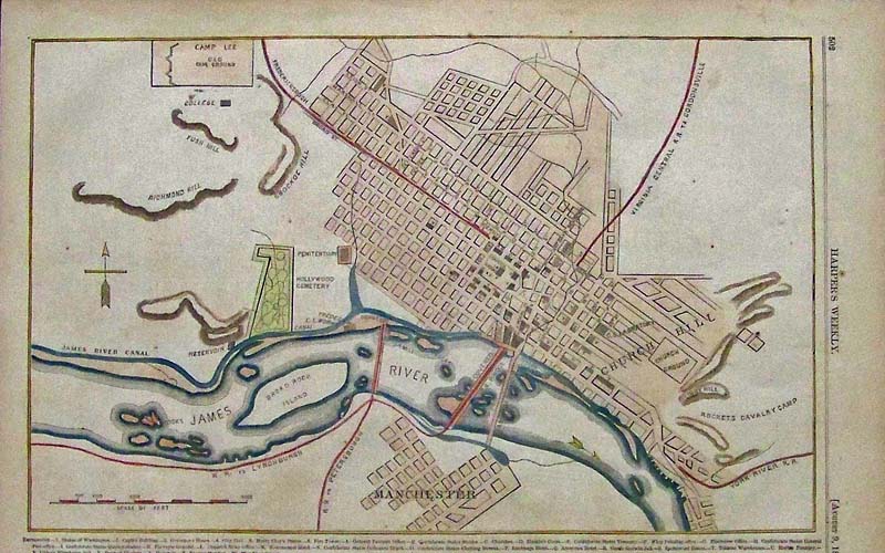![]() 136rm: Map of Richmond, Virginia, and its Environs. 1862. Civil War era showing rebel forts, major roads, railroad and rivers. Hand colored, wood engraving. 10 ½ x 15 ¾ in. $30 ![]() 137rm: Richmond Map c.1895 also showing Manchester, James River, major streets and prominent locales, steam railroads and horse railroads. Printed in color. 11 x 14 3/8 in. $60 ![]() 138rm: The City of Richmond, Virginia - Showing two views of Gamble's Hill and view looking Westward. (St. Paul, 2d Baptist Church, City Hall, Capitol, Governor's House, Belle Isle and Holywood Cemetery. 1865 Harper's Weekly. Hand colored, wood engraving. 10 3/4 x 15 3/8 in. $60 ![]() 139rm: View of Richmond, VA., from the Prison-Camp at Belle Isle, James River. 1865 Frank Leslies'. Wood engraving. 10 1/2 x 15 1/2 in. $60 ![]() 140rm: The City of Richmond, Virginia. Top half showing Map of the James River Etc. from Richmond to the Ocean. 1862 Harper's Weekly. Hand colored, wood engraving. **Has been archivally mended/patched center fold. 15 5/8 x 22 in. $120 ![]() 128rm: 1862 Harper's Weekly hand colored wood engraving titled, "Birds Eye View of Richmond and the Vicinity." 16 x 11 in. $80 ![]() 129rm: 1868 Harper's Weekly hand colored wood engraving titled, "At the Market, Richmond, Virginia." Sketched by W.L. Sheppard. 16 x 11 in. $60 ![]() 130rm: 1877 Hand colored wood engravings featured in Harper's Weekly titled, "The Virginia State Agricultural Fair at Richmond -- Visit of President Hayes." From Sketches by Theo. R. Davis. 15-1/2 x 10-1/2 in. $50 ![]() 131rm: 1889 Hand colored wood engraving titled, "Virginia -- Interior of a Junk-Shop in the City of Richmond -- A Bazaar of War-Relics and Odds and Ends of Every Sort." Drawn by W.L. Sheppard. Featured in Frank Leslie's Illustrated Newspaper. 16 x 11 in. $80 ![]() 132rm: 1866 Hand colored wood engraving titled, "View of Shockoe Creek Valley, Richmond, Virginia." Sketched by J.R. Hamilton. Featured in Harper's Weekly. 16 x 11 in. $80 ![]() 133rm: 1863 Wood engraving from Harper's Weekly showing the Interior View of Libey Prison, Richmond, Virginia, Shwoing the Quarters of the Union Officers Confined There. Sketched by Captain Harry E. Wrigley, Topographical Engineer. 16 x 11 in. $70 ![]() 134rm: 1862 Hand colored wood engraving featured in The Illustrated London News showing top and bottom images. Top image is titled, "The Civil War in America: The Last Stand Made by the Federals at Manassas," and bottom image is titled, "The Civil War in America: View, From the West, of Richmond, Virginia, Capital of the Confederate States." 22 x 16 in. $150