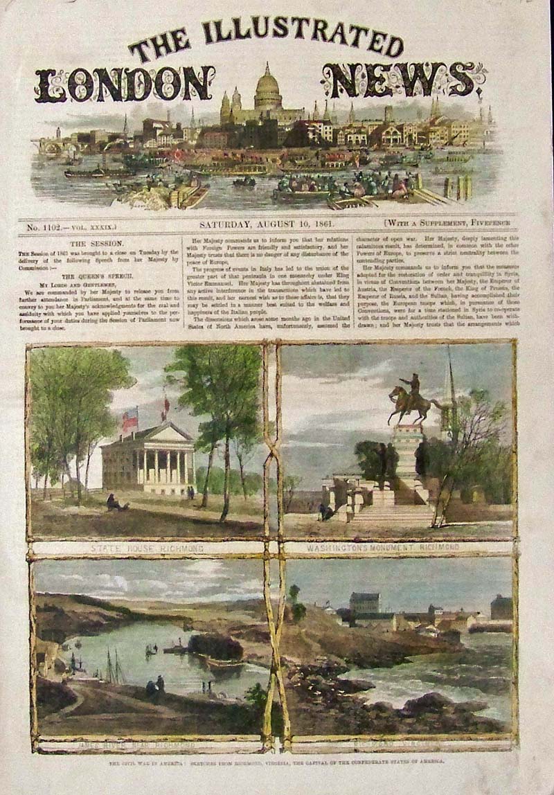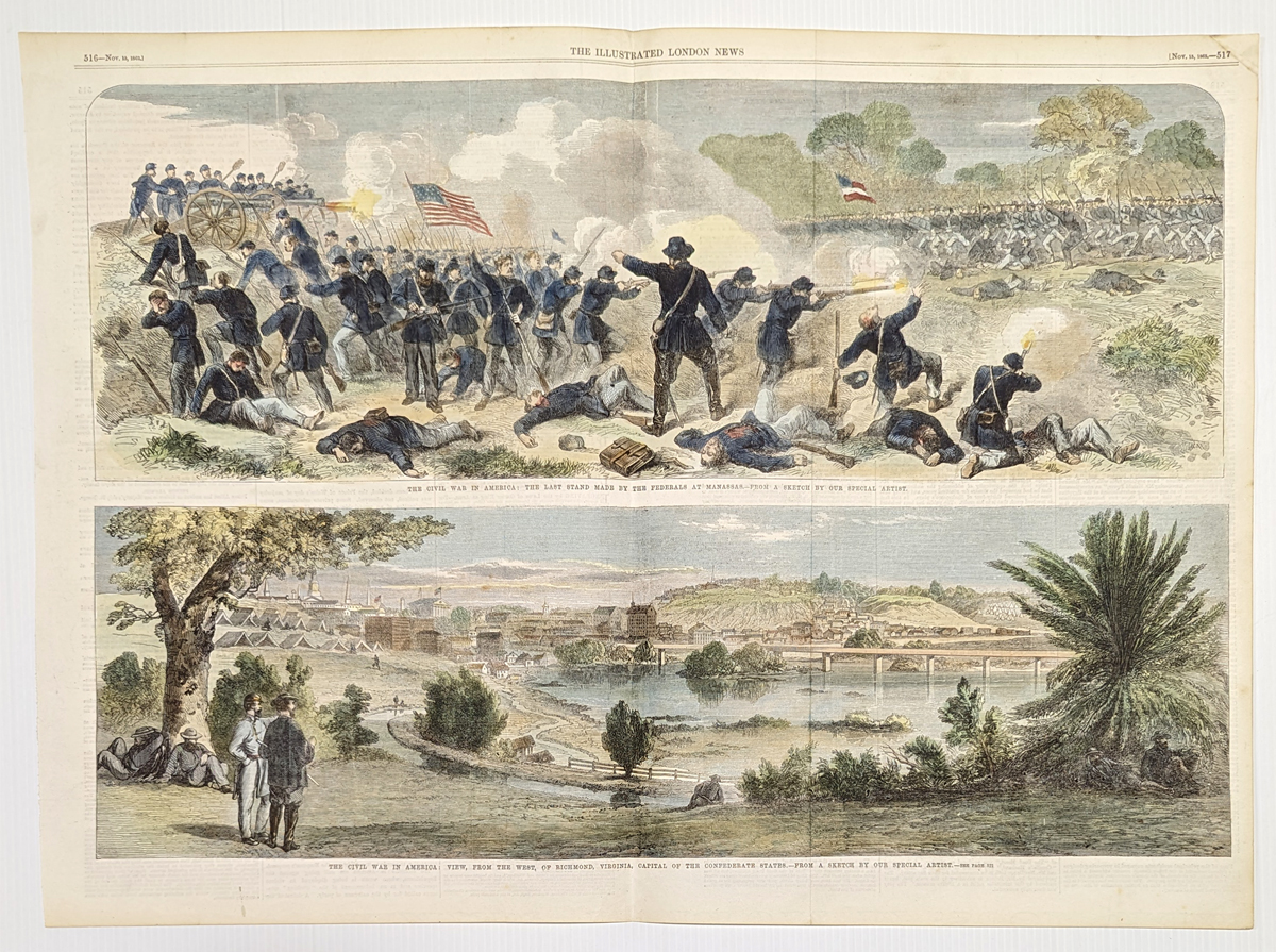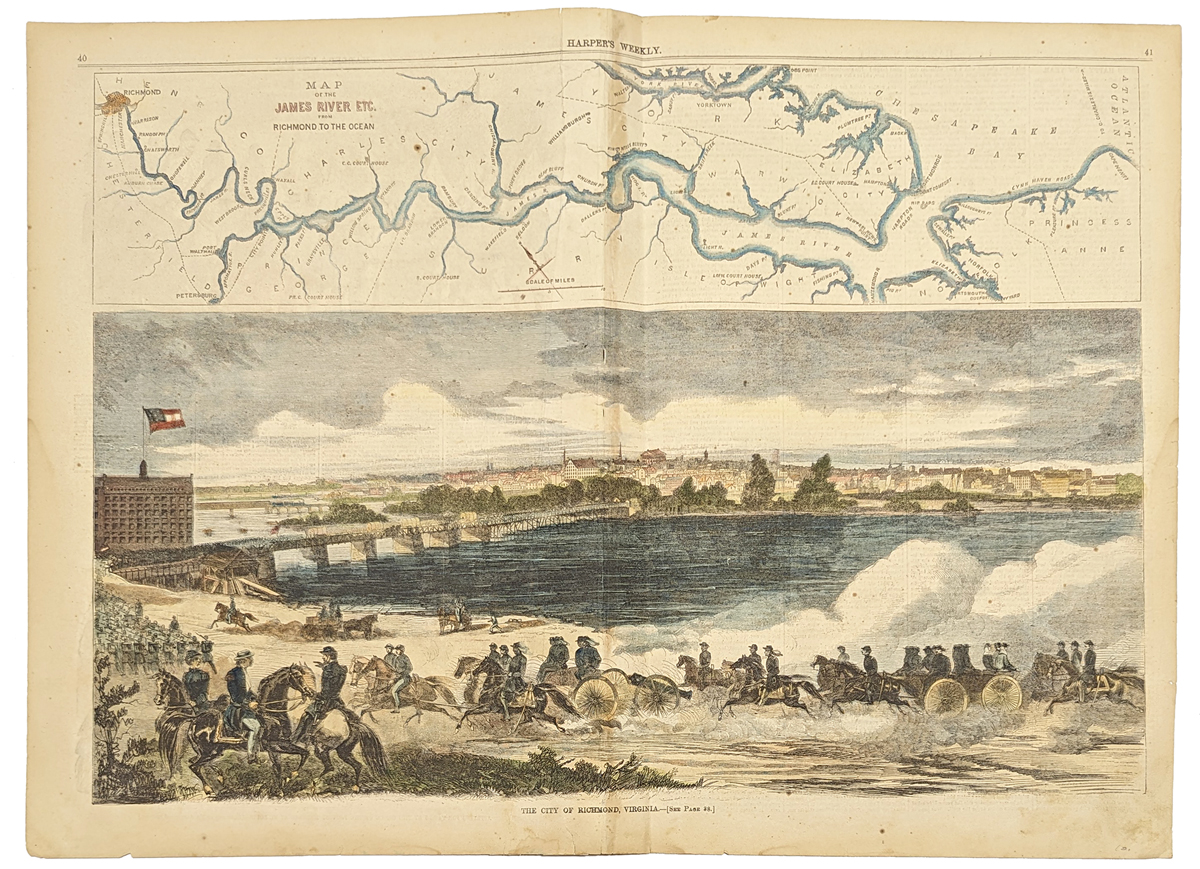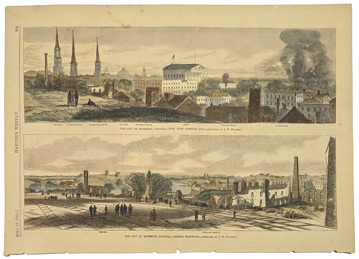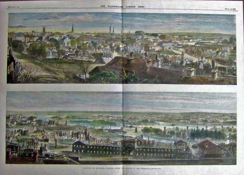 135rm: 1865 Hand colored wood engraving featured in The Illustrated London News which shows a Panorama of Richmond, Virginia, (in top image) and After its Capture By the Federals.(Bottom image). 21-1/2 x 16 in. $160 |